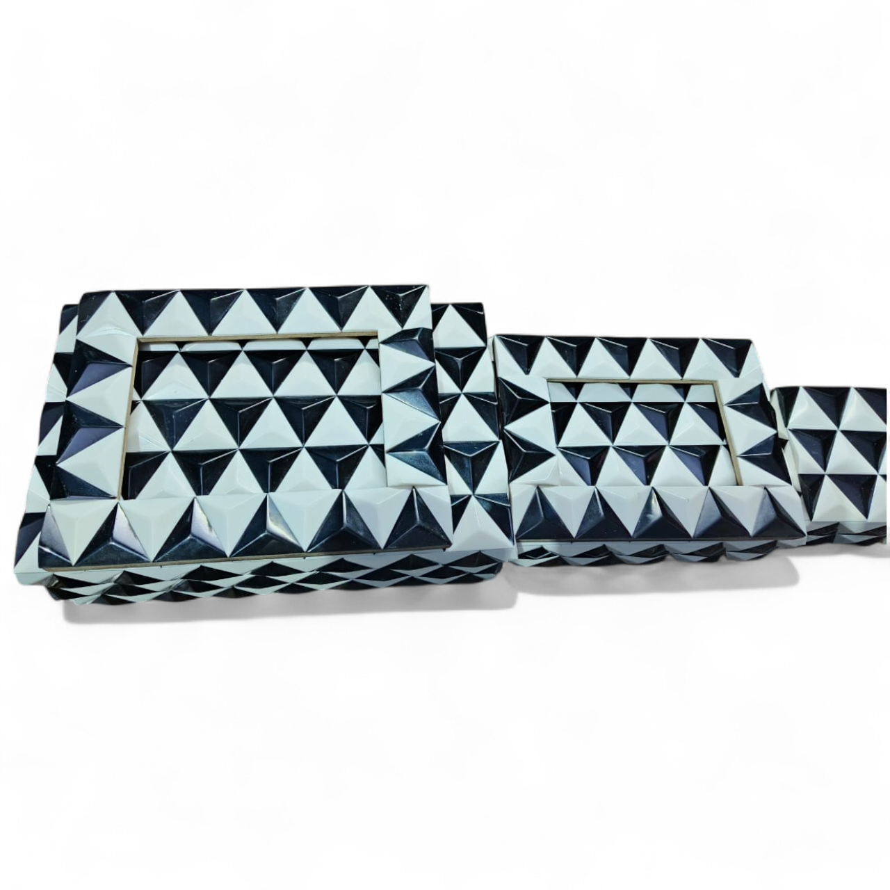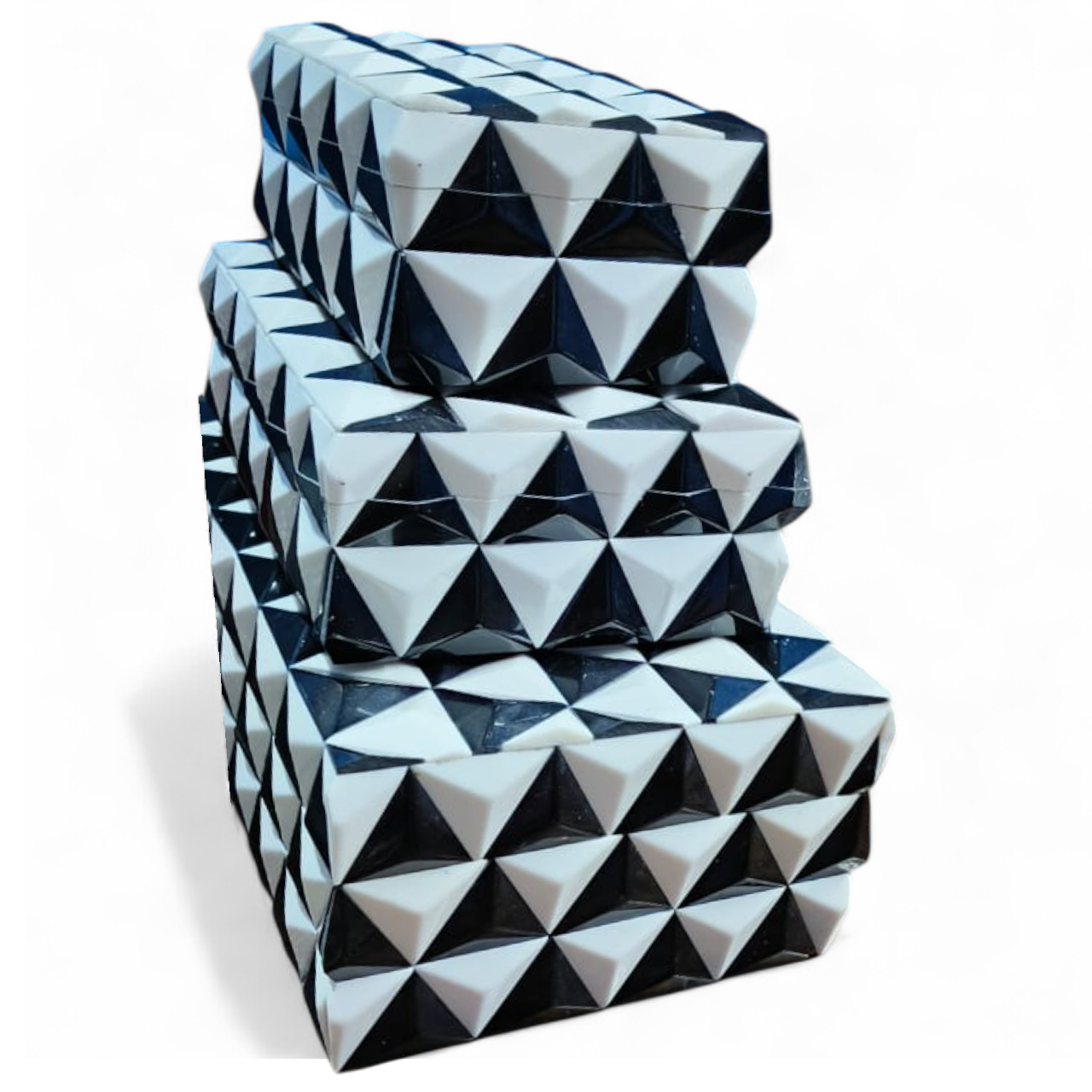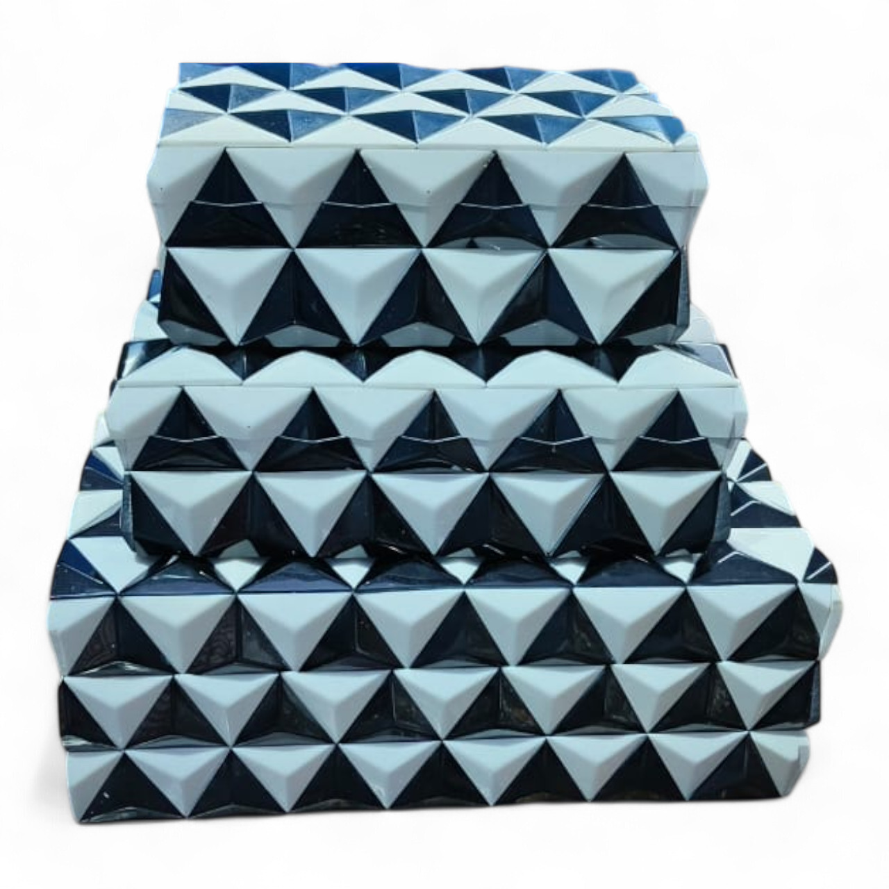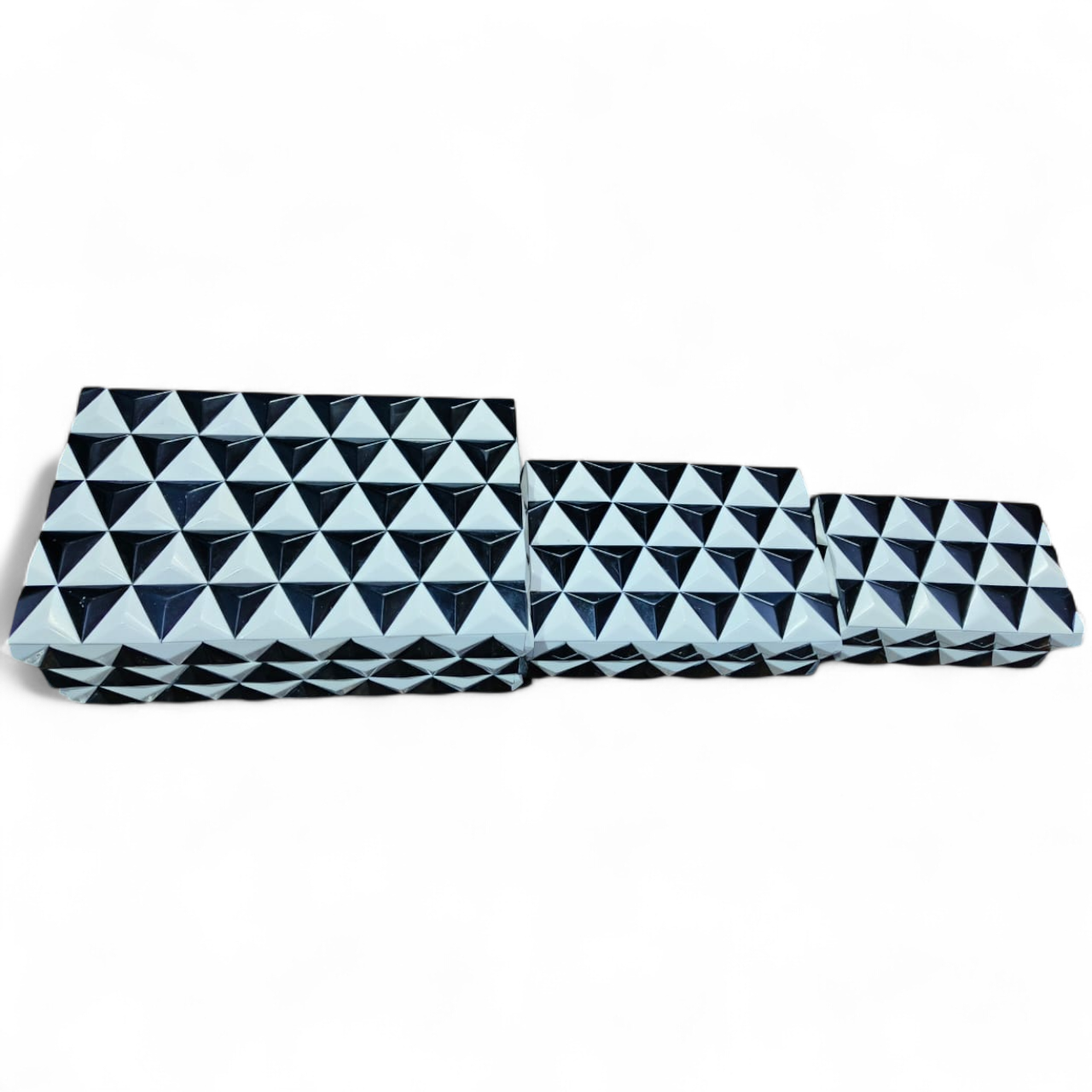 Elevate your storage game with this 3-piece handcrafted Pyramid Resin Jewellery Box Set from RB Artisan. Each box is a blend of elegance and durability, crafted with premium resin and MDF for lasting beauty. The bold black & white pyramid pattern adds a unique geometric charm, making it perfect for modern interiors. Use these versatile boxes to organize your jewellery, trinkets, or valuables, or simply showcase them as statement pieces on your dresser, shelf, or tabletop. Ideal for gifting, décor stores, and boutique collections, this set is a blend of functionality and luxury.