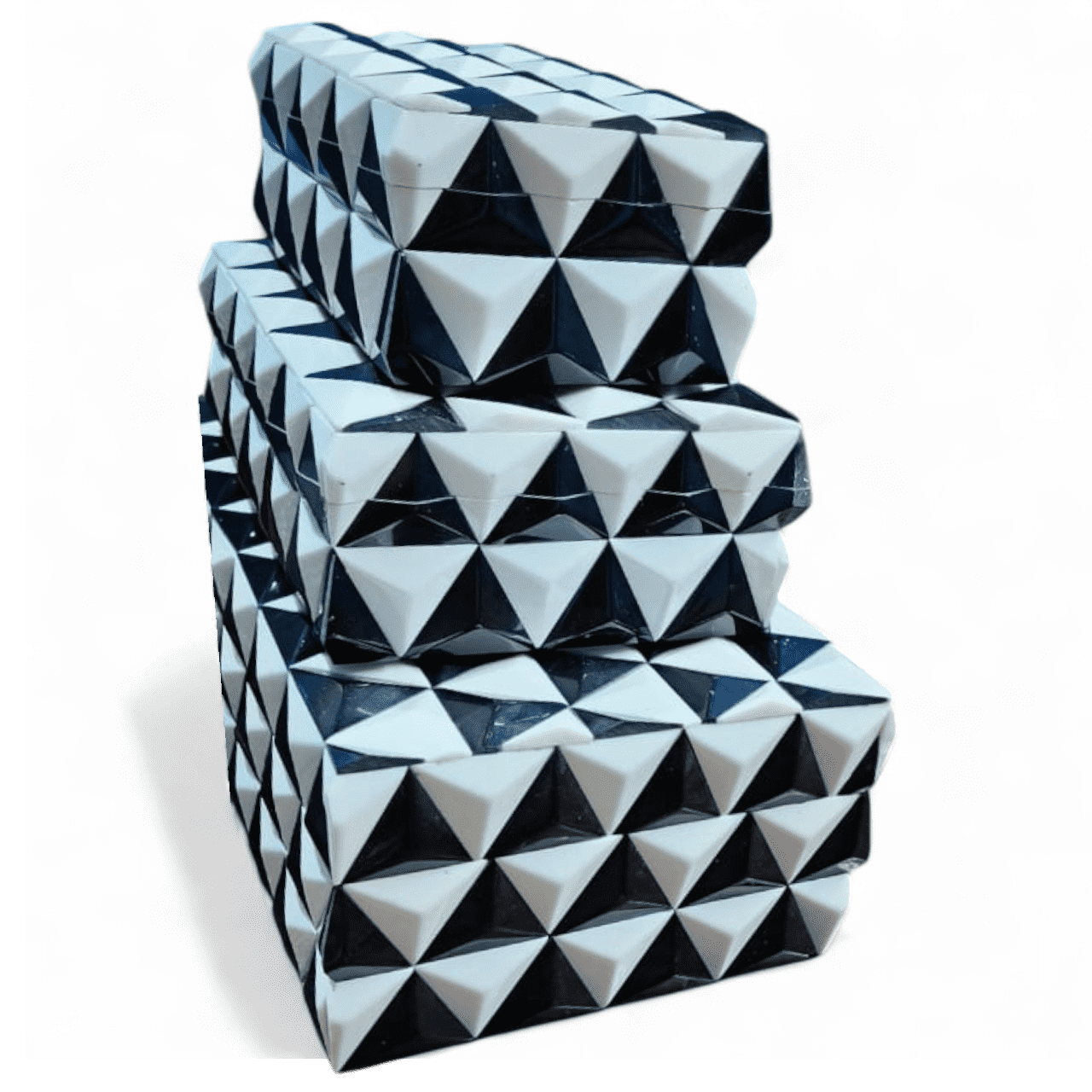 Elevate your storage game with this 3-piece handcrafted Pyramid Resin Jewellery Box Set from RB Artisan. Each box is a blend of elegance and durability, crafted with premium resin and MDF for lasting beauty. The bold black & white pyramid pattern adds a unique geometric charm, making it perfect for modern interiors. Use these versatile boxes to organize your jewellery, trinkets, or valuables, or simply showcase them as statement pieces on your dresser, shelf, or tabletop. Ideal for gifting, décor stores, and boutique collections, this set is a blend of functionality and luxury.