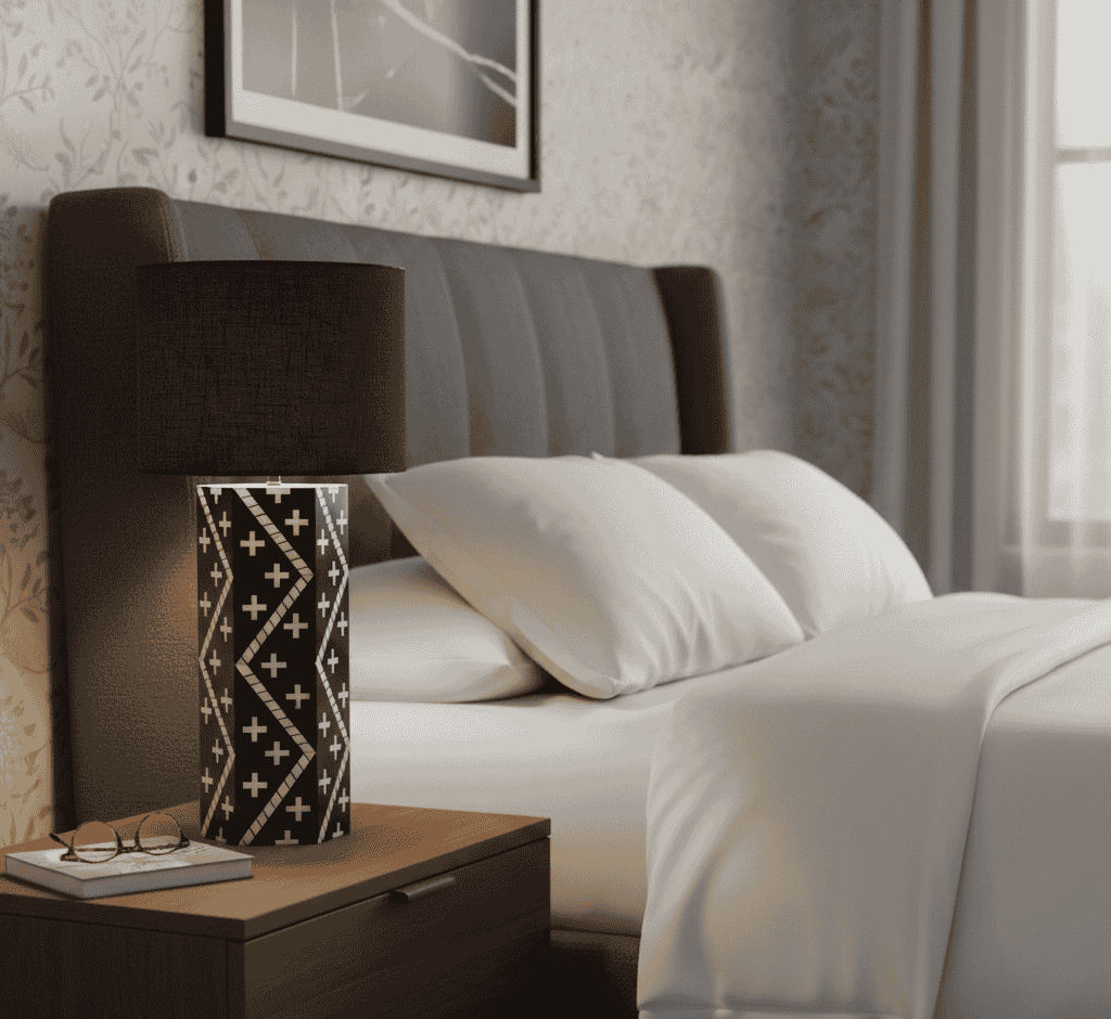 Handcrafted by skilled artisans, this Plus Pattern Resin Table Lamp features a contemporary black and white design that enhances modern interiors. The sturdy resin base combined with a soft fabric shade creates warm ambient lighting, making it perfect for bedside tables, side tables, and decorative corners. Ideal for bulk buyers, interior designers, and export markets.
