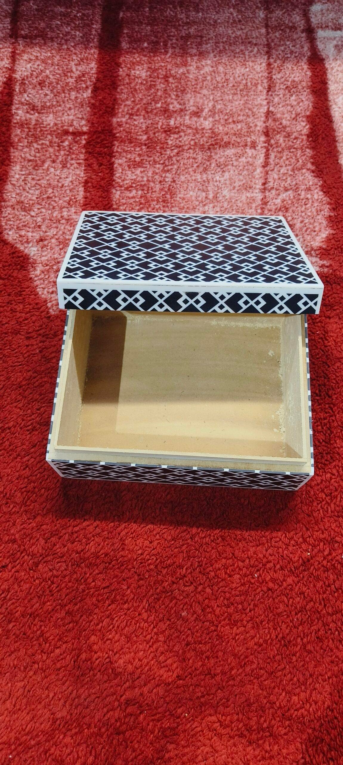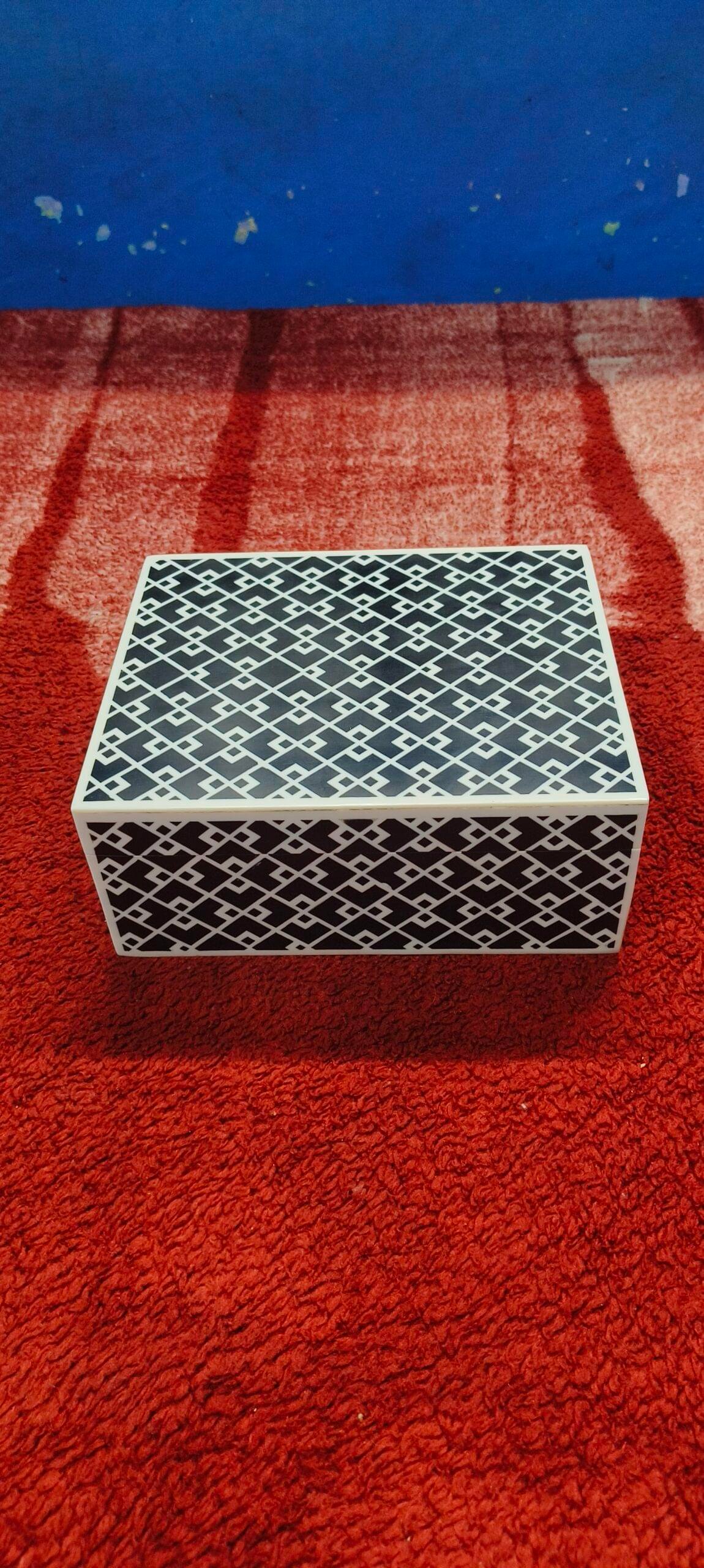 This handcrafted Diamond Line Resin Jewellery Box by RB Artisan is a luxurious and functional storage piece designed to enhance the elegance of your home. Featuring a bold black base with crisp white diagonal lines, this box merges modern design with traditional craftsmanship. It’s ideal for storing jewellery, makeup, accessories, or even gifting. The box offers sophistication, durability, and versatility — making it suitable for use in living rooms, dressing tables, office desks, or gifting occasions.