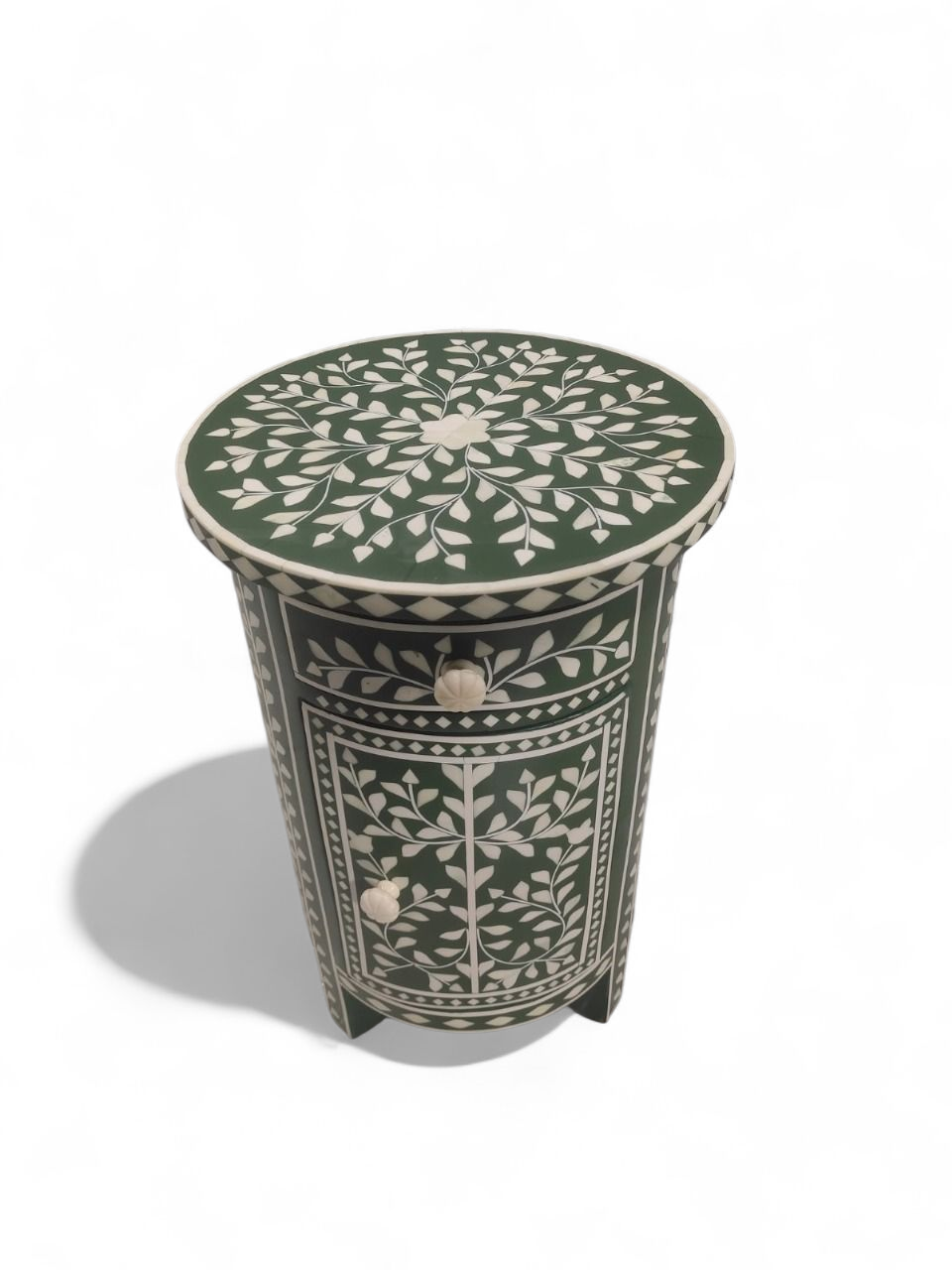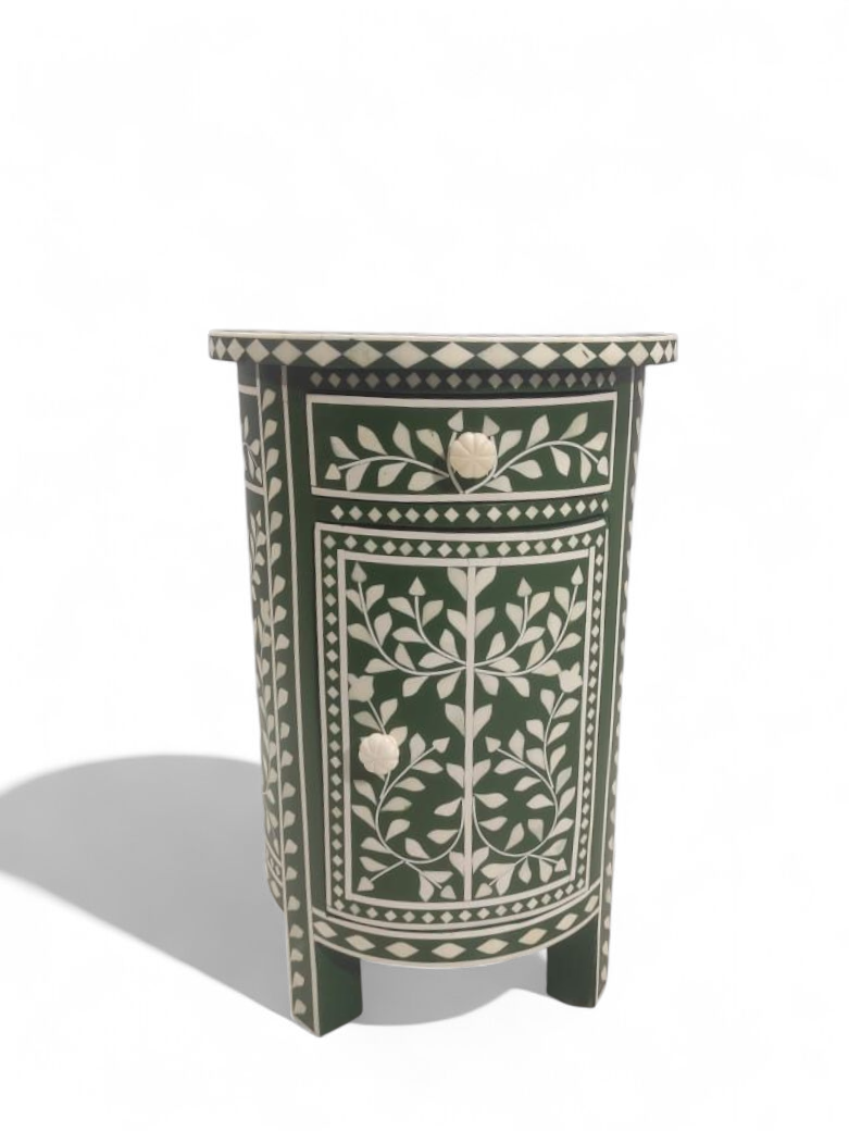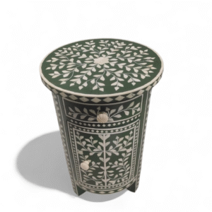 Handcrafted by skilled artisans, this white bone Inlay Side Table by RB ARTISAN features a striking floral white inlay design on a rich green base.