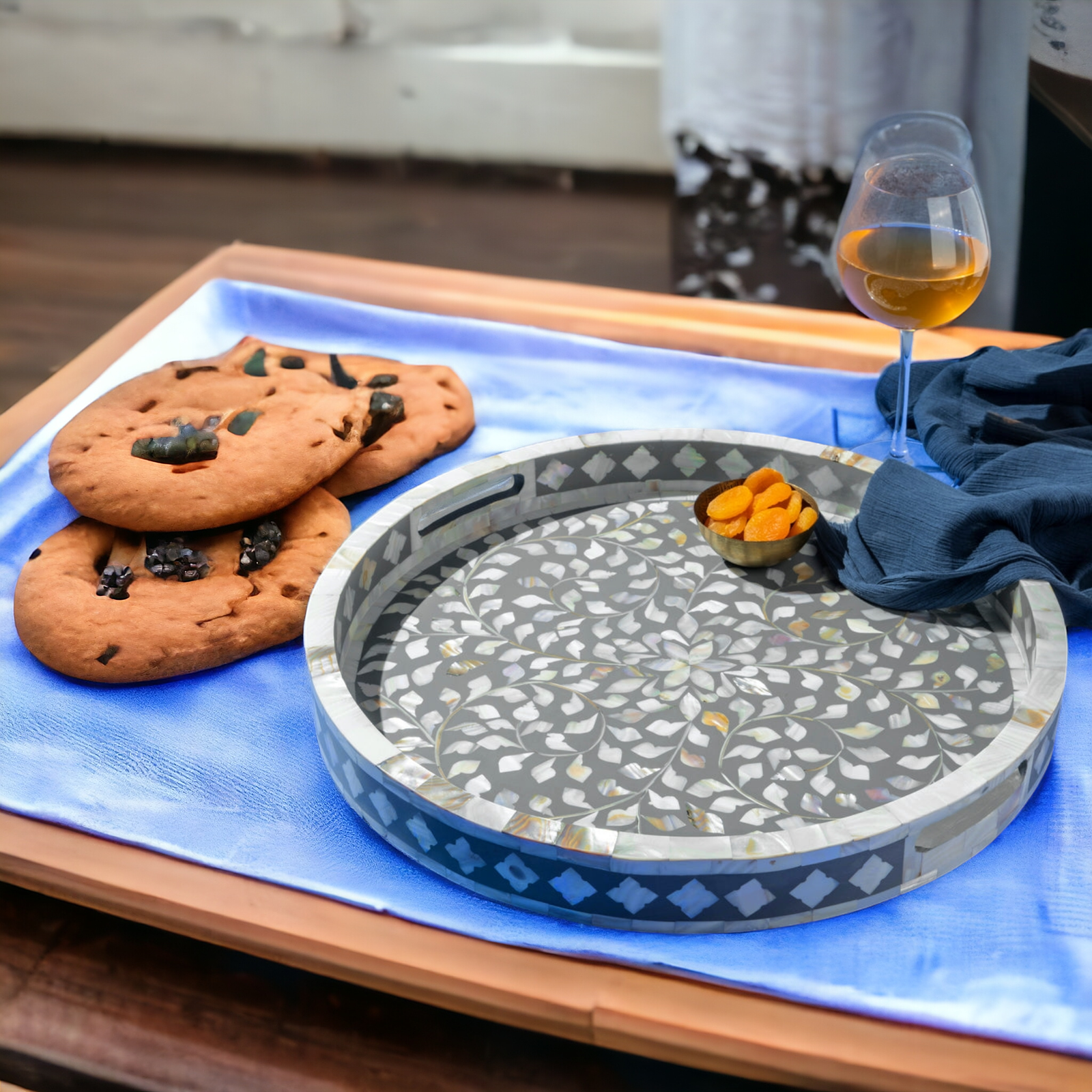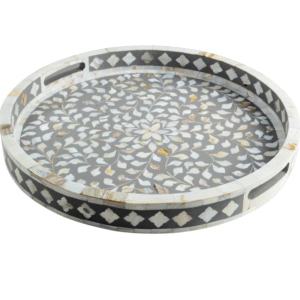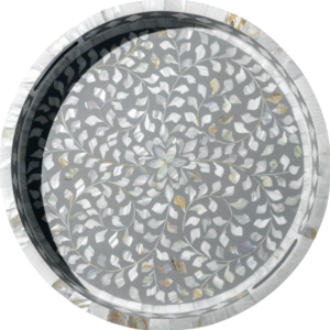 RB ARTISAN Grey Floral Inlay Tray is an elegant 18-inch handcrafted round tray featuring white floral inlay design on a soft grey resin base. Its minimalist color palette and refined craftsmanship make it perfect for luxury serving, festive gifting, or contemporary table décor.