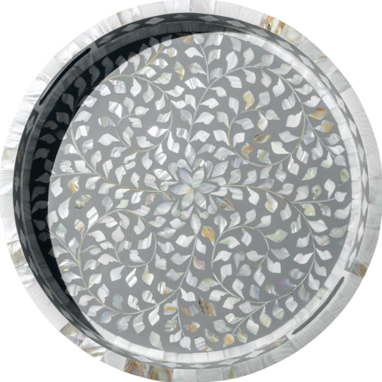 This Grey Floral Inlay Tray by RB ARTISAN is a sophisticated piece designed for both function and style. The subtle grey tone contrasts beautifully with the intricate white mother of pearl floral inlay, offering a luxurious look for any modern home or premium gifting set.