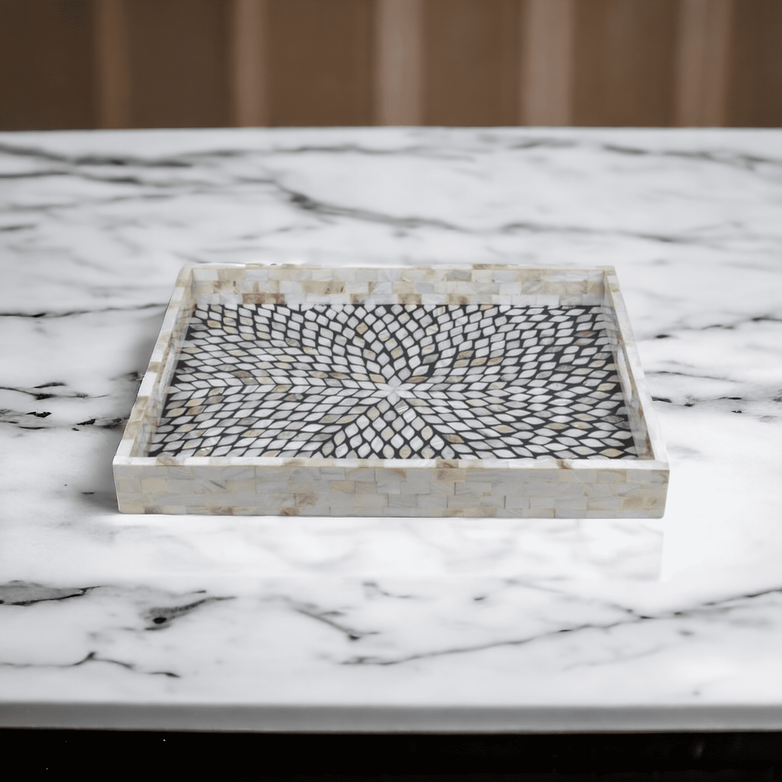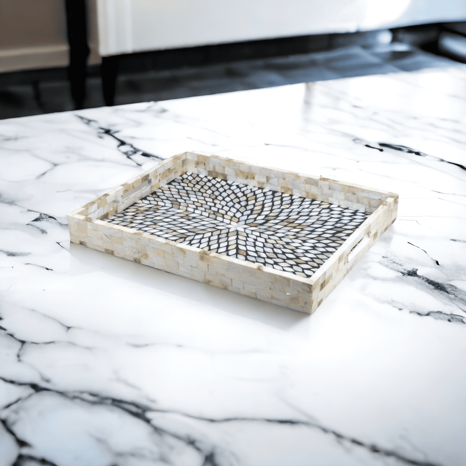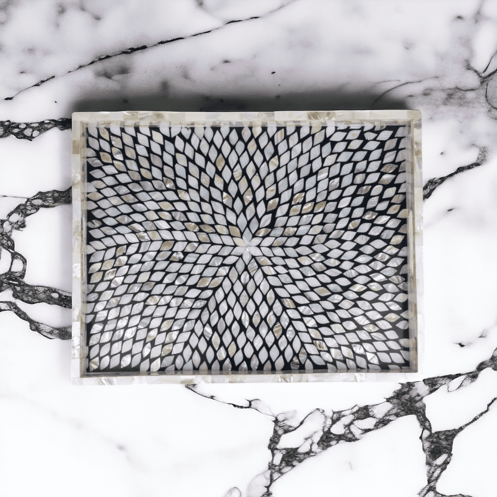RB ARTISAN Mother of Pearl Inlay Tray features a striking leaf-pattern mosaic handcrafted from genuine MOP pieces, set over a deep black resin base on durable MDF. With its shimmering pearl accents and bold contrast, this tray serves as both a functional piece and a statement décor element.