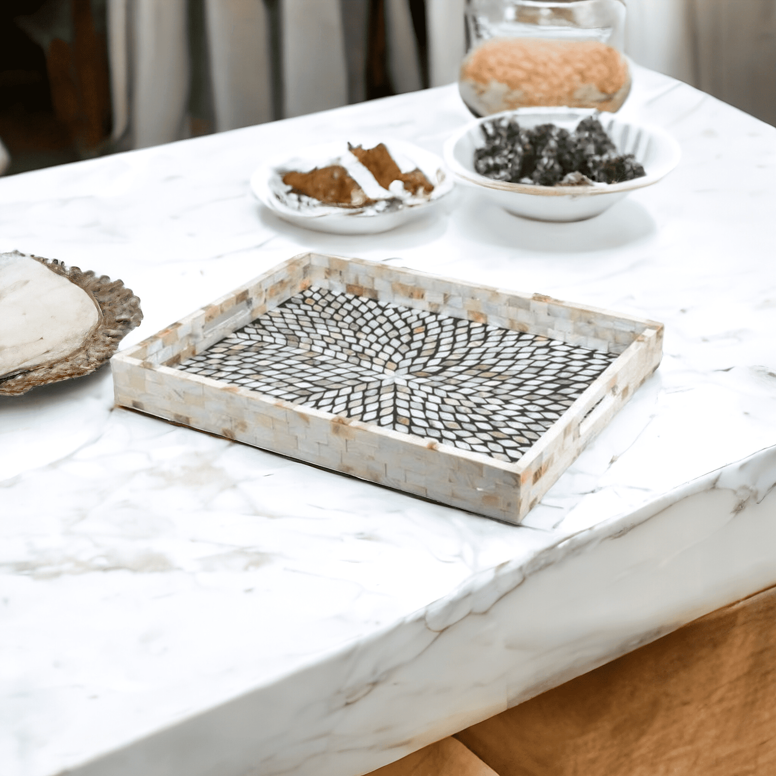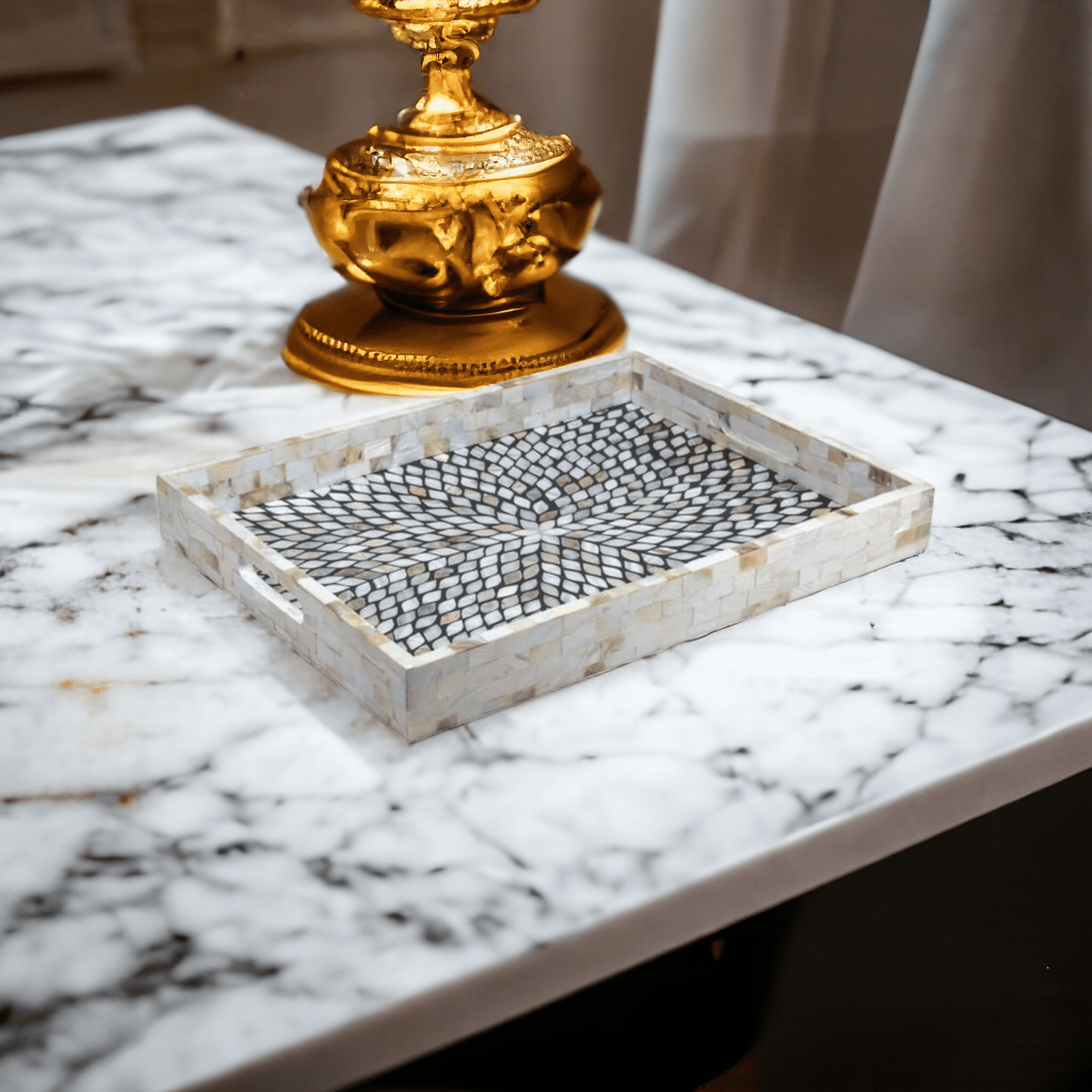 This handcrafted Mother of Pearl Inlay Tray showcases a mesmerizing leaf motif, with each pearl piece meticulously cut and set into black resin over a sturdy MDF base. The iridescent MOP catches the light beautifully, making this tray both a practical serving accessory and a luxurious décor statement. Ideal for adding elegance to living spaces or gifting, each piece is unique due to natural variations in the shell.