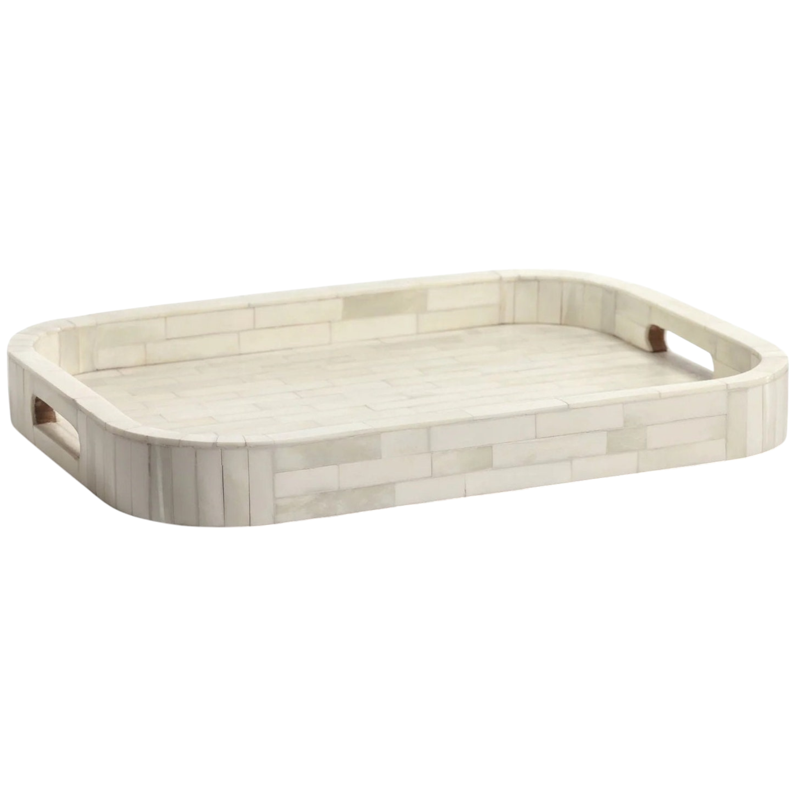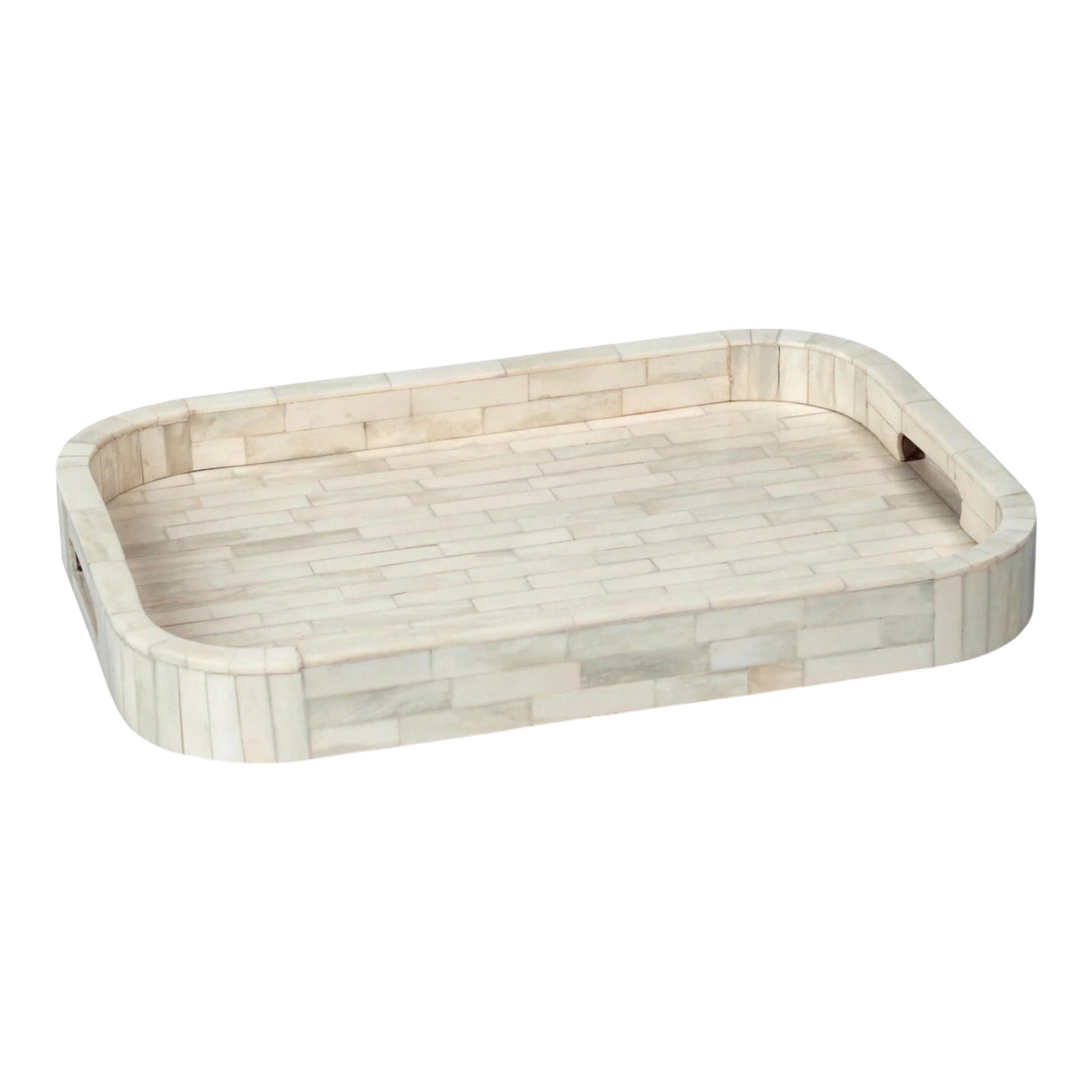 This tray features a stunning brick-like pattern crafted entirely from natural white bone pieces, creating a clean and elegant look. The handcrafted arrangement adds a subtle texture, making it a refined piece for modern and classic interiors alike. Perfect for serving or display, it offers timeless charm with artisanal craftsmanship.