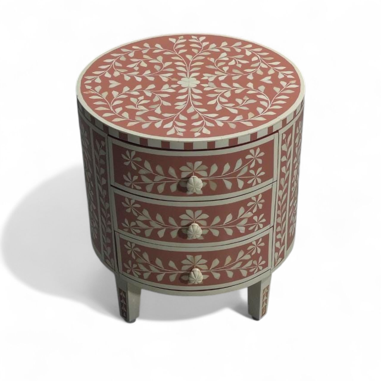 RB ARTISAN Terracotta Orange Resin & bone Inlay Round Side Table with 3 Drawers.