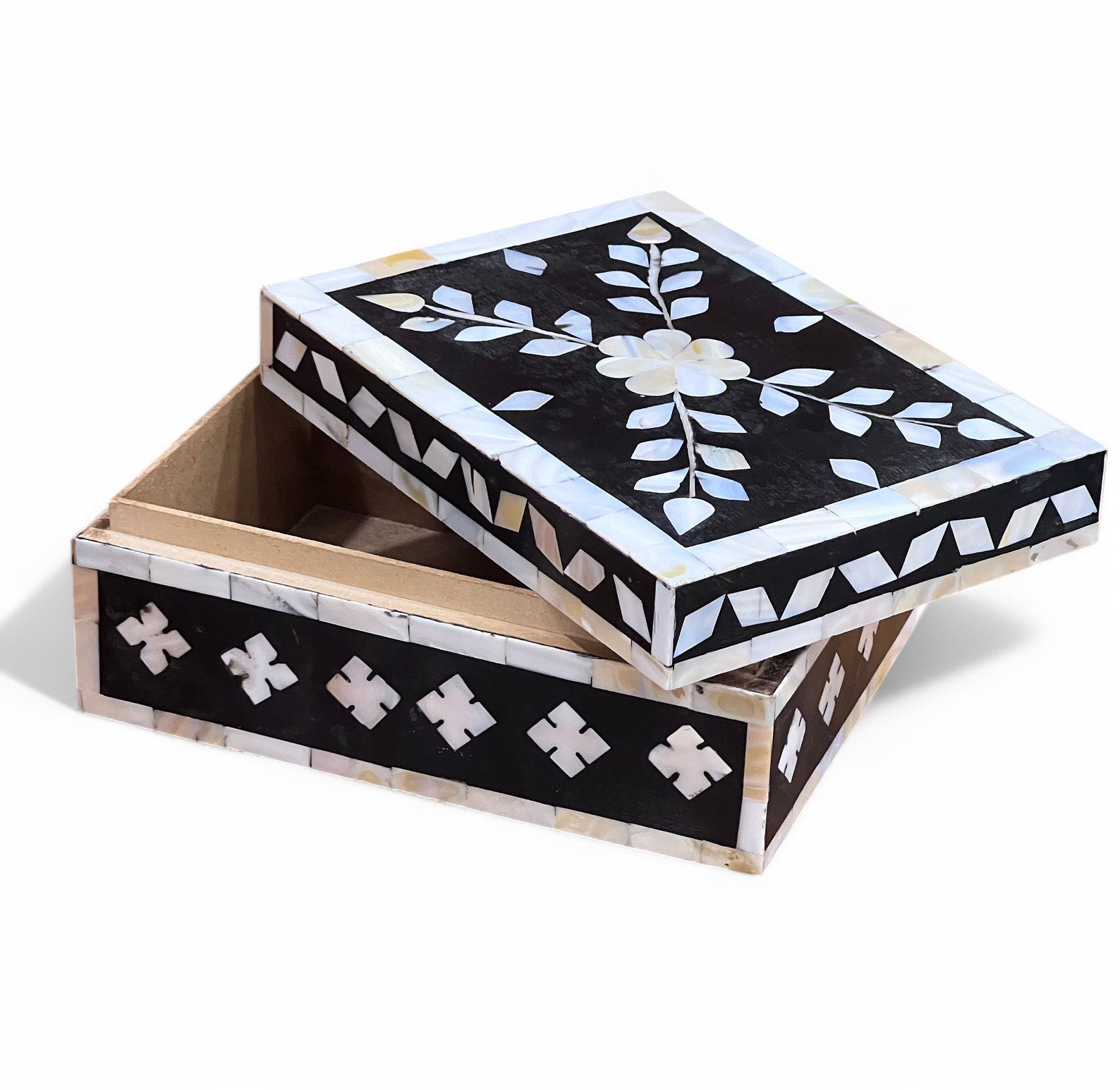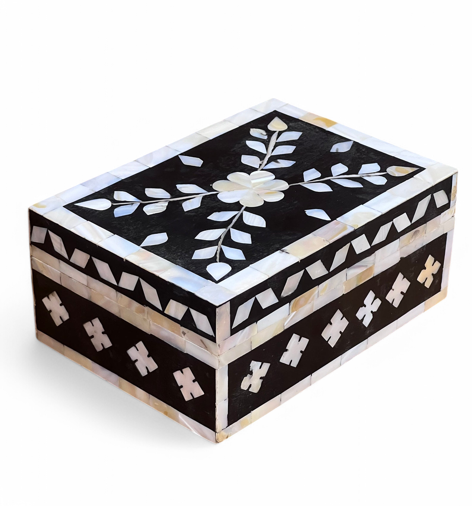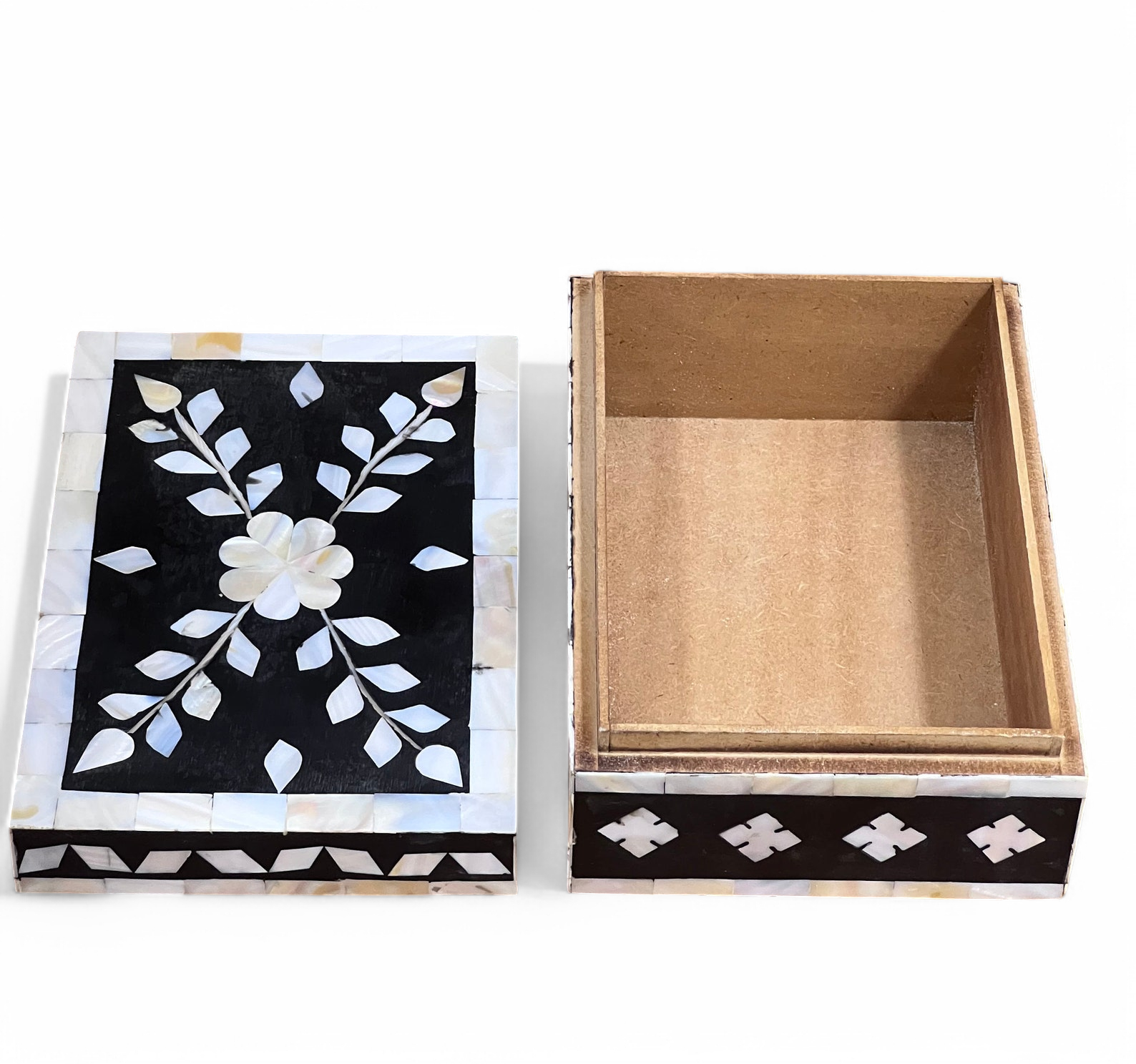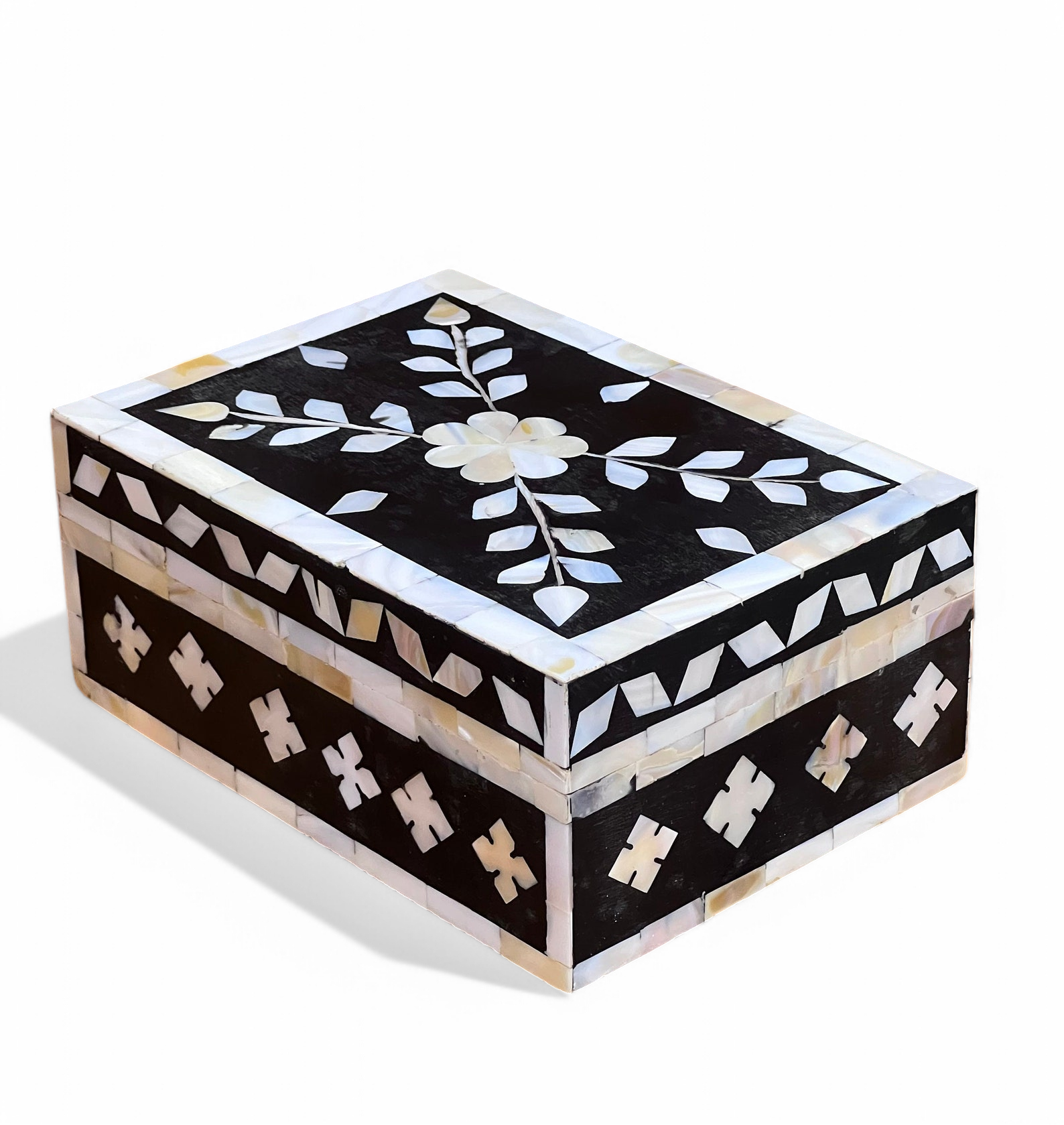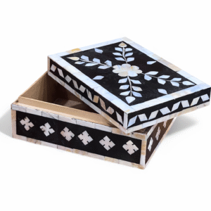 Adorned with mother of pearl floral inlay, this RB ARTISAN jewellery box adds luxury to your dressing space or shelf. It reflects elegance with its handcrafted detailing and a polished black background that highlights every curve of the flower motif. Designed for sophisticated storage, this box is ideal for jewellery, trinkets, or gifting. A collector’s piece for connoisseurs of refined craftsmanship.
