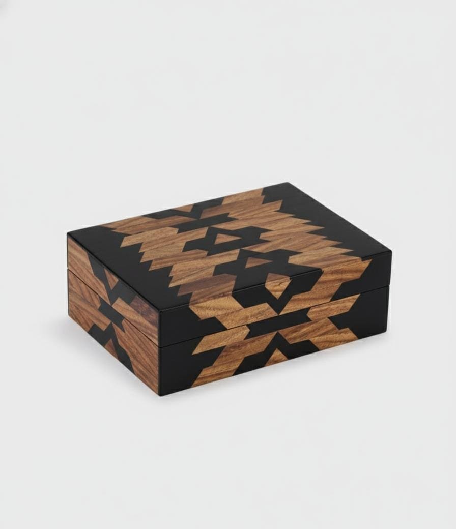 This black geometric inlay jewellery box beautifully blends modern design with traditional craftsmanship.