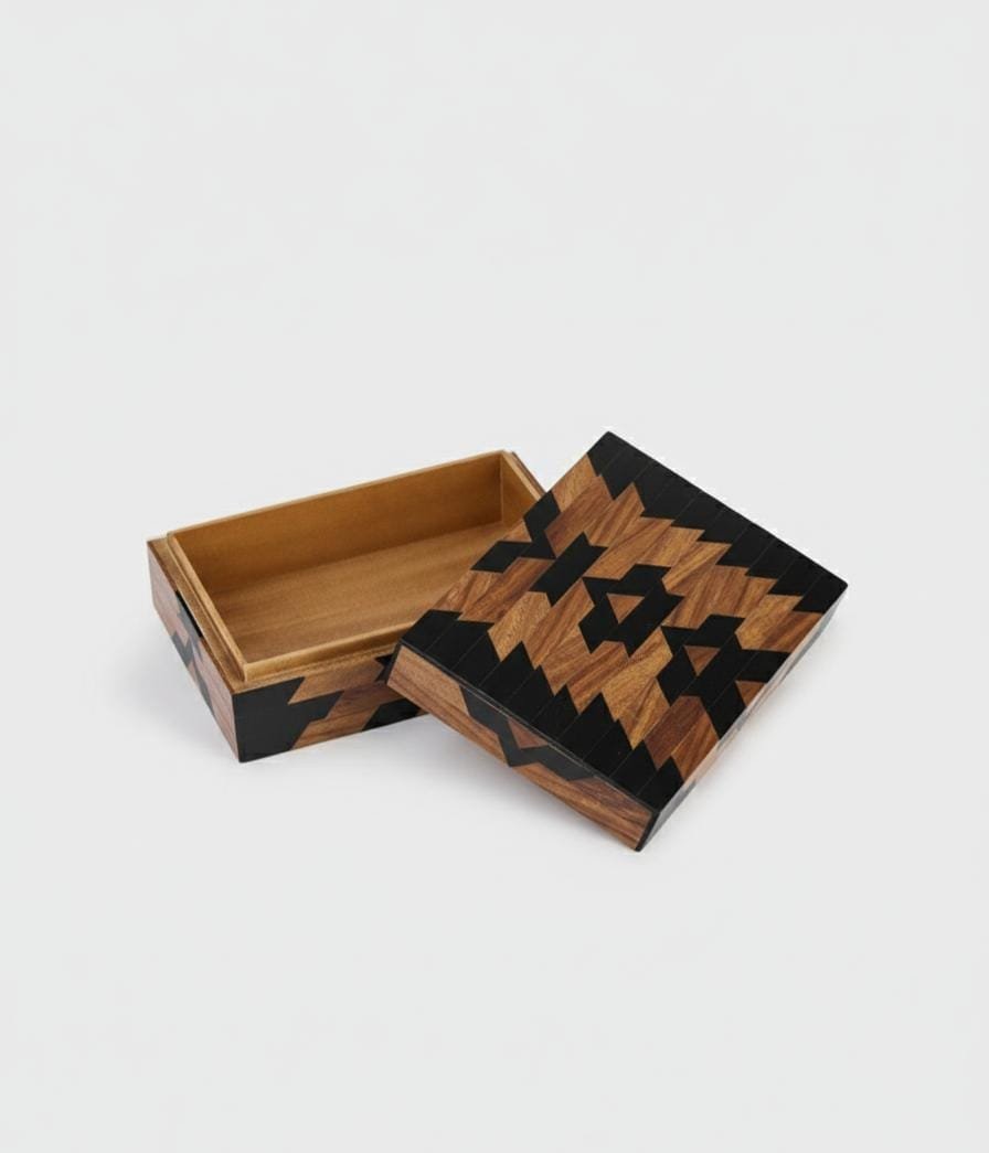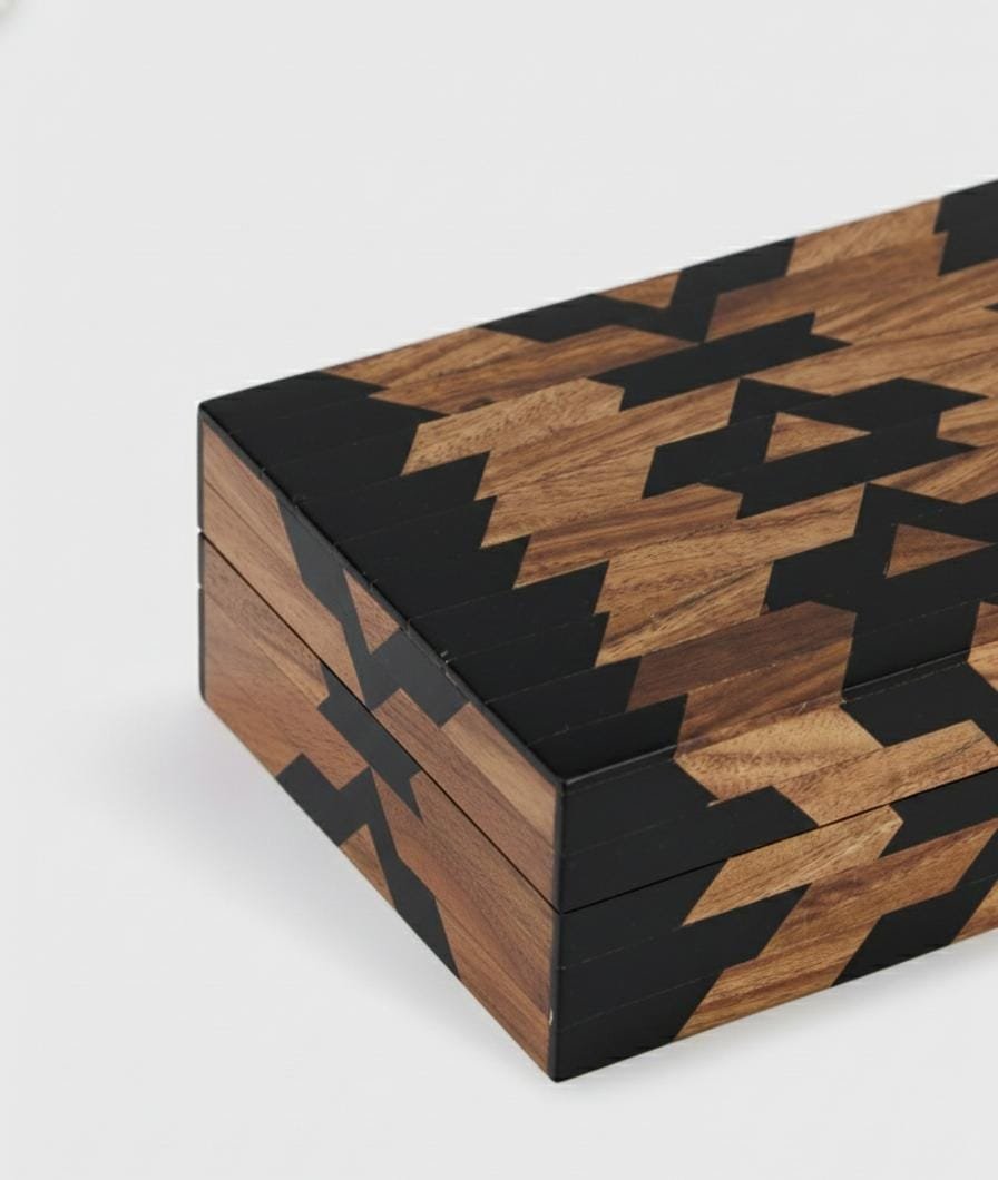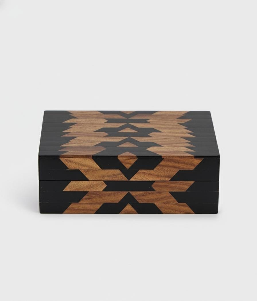 Handcrafted from premium mango wood and black resin, this exquisite piece features a striking tribal-inspired geometric pattern.