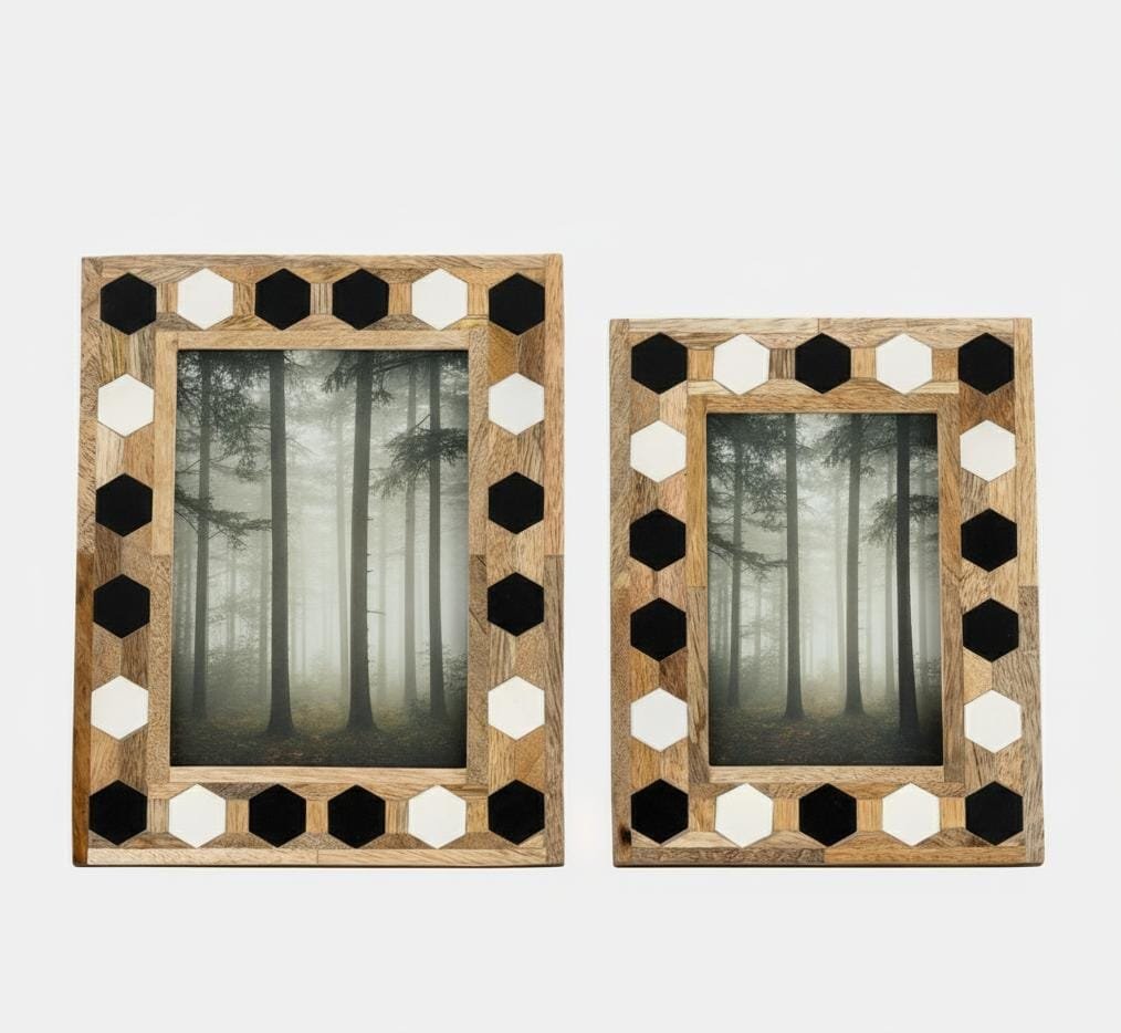 Expertly handcrafted from premium natural wood and high-quality resin, this frame showcases an eye-catching black and white hexagonal pattern that beautifully contrasts with the warm wood tones.