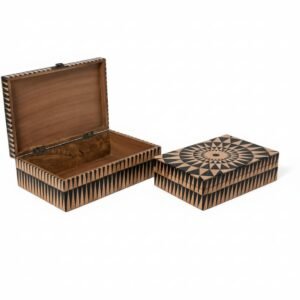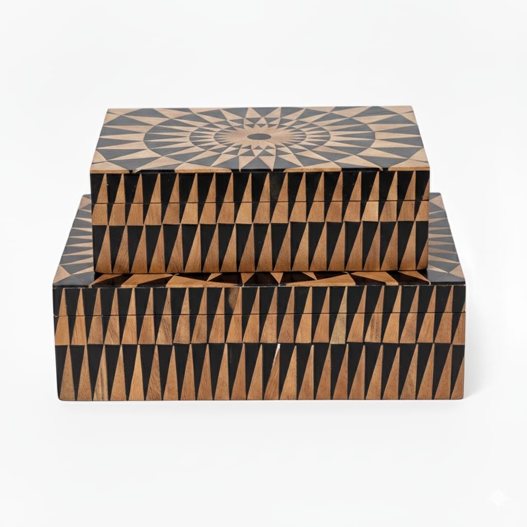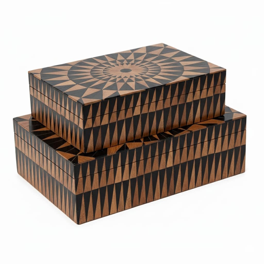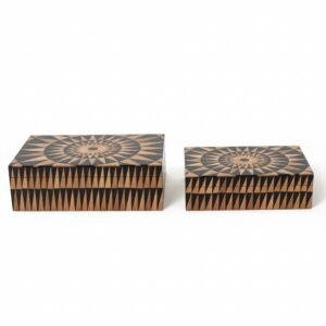 Expertly handcrafted from high-quality resin with a natural wood finish, this elegant pair of boxes showcases a stunning geometric sunburst pattern.