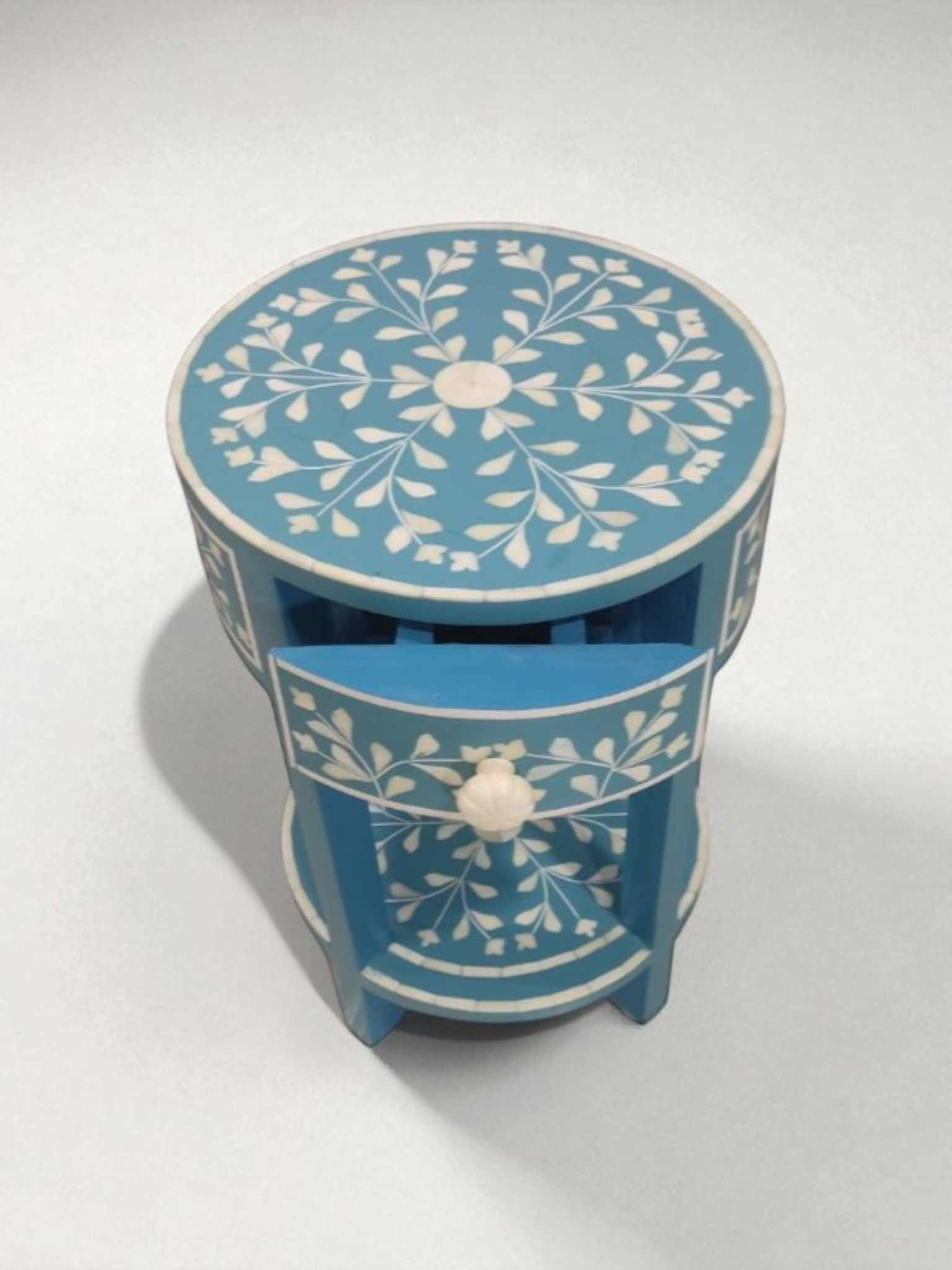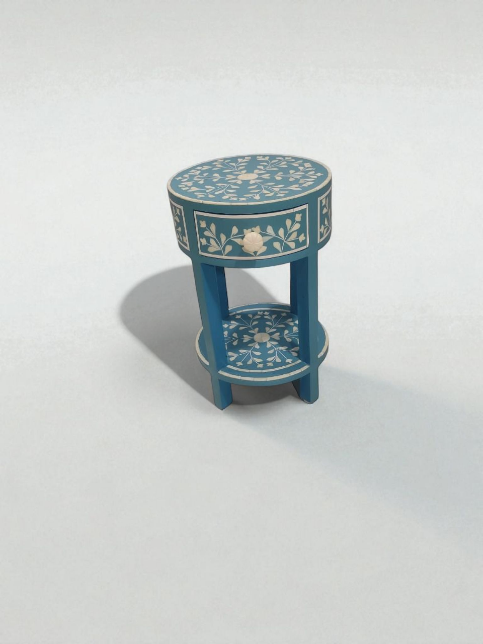 RB Artisan Blue Floral Inlay Side Table is a beautifully handcrafted bedside table designed to elevate your home decor. Made from high-quality wood and decorated with exquisite white floral resin inlay patterns, this table brings both elegance and functionality. Ideal for placing lamps, books, or decorative items, it adds a touch of artistic charm to your bedroom or living room. The table includes a drawer for small storage and a lower shelf for additional utility. Perfect for modern and traditional interiors.