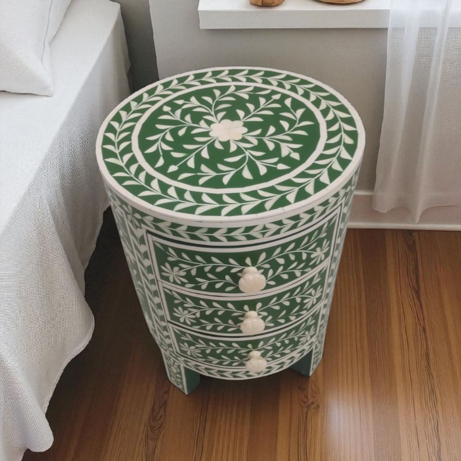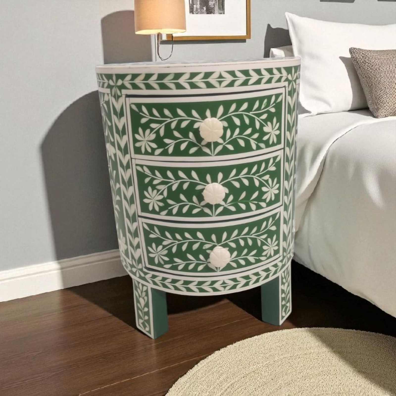 RB Artisan Green Floral Inlay Side Table is a stunning handcrafted bedside table designed to enhance any home decor. Made from high-quality wood and decorated with intricate white floral resin inlay patterns on a green background, this side table adds elegance and charm to your bedroom or living room. It includes three storage drawers with resin knobs and sturdy legs, offering both functionality and artistic beauty. Ideal for modern, vintage, or traditional interiors.
