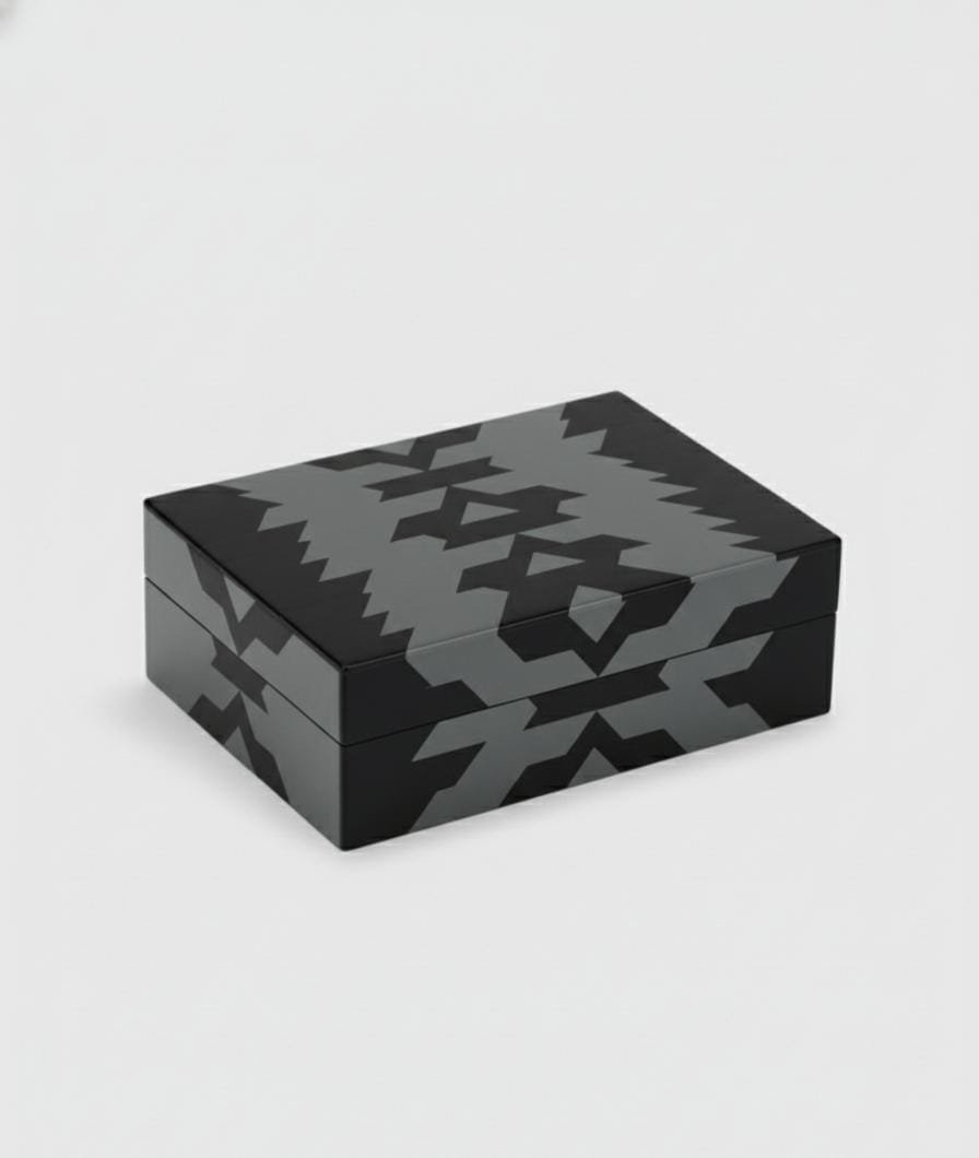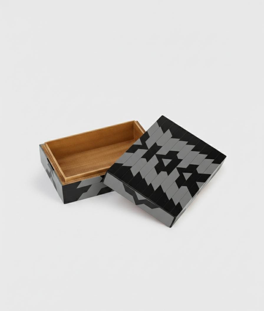 Handcrafted with precision, this box showcases a bold geometric pattern made from premium grey and black resin.