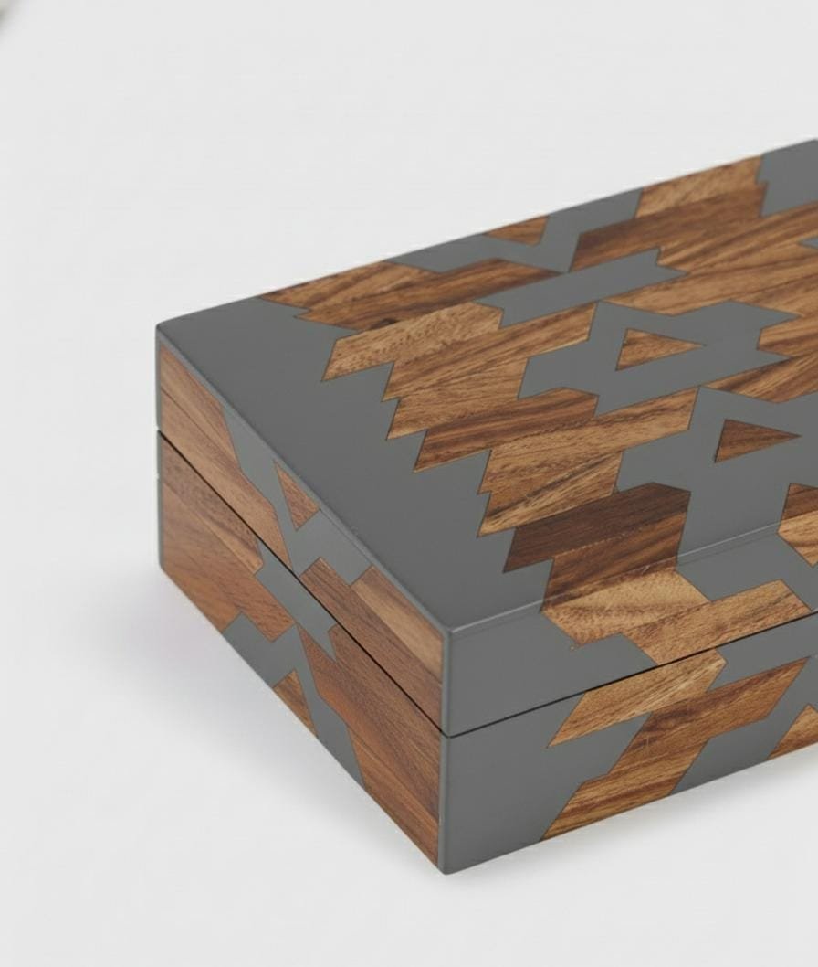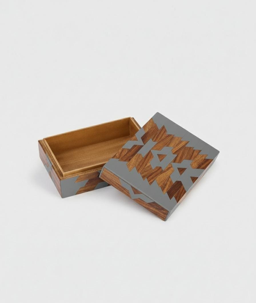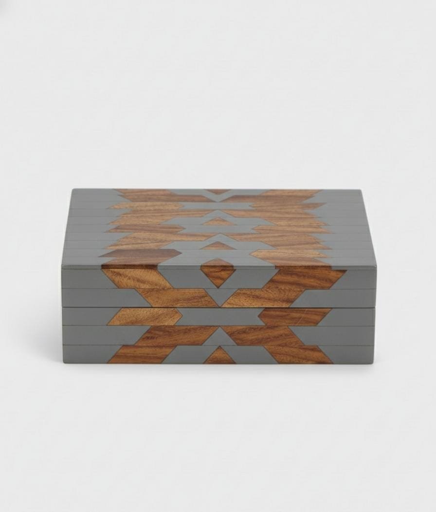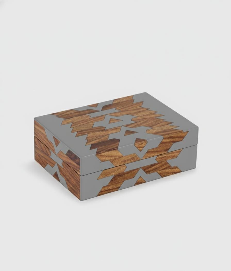 Beautifully handcrafted from premium mango wood and grey resin, this jewellery box showcases a stunning geometric inlay pattern.