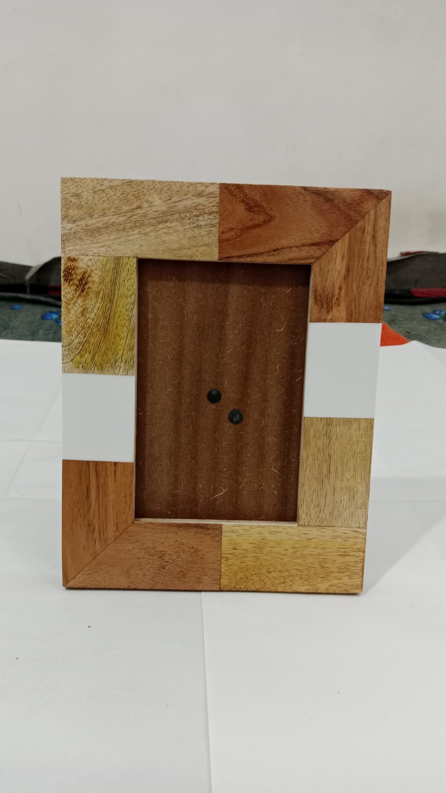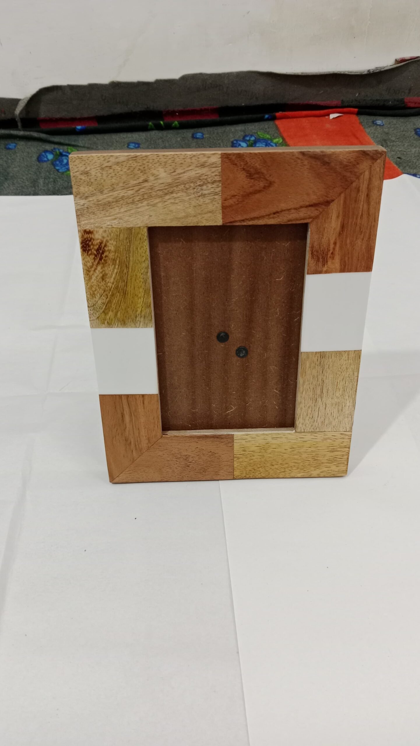 RB ARTISAN Wood, Resin & MDF Photo Frame combines natural wood tones with glossy resin in a block pattern for a contemporary yet warm look. Perfect for displaying cherished photographs on a table or shelf.