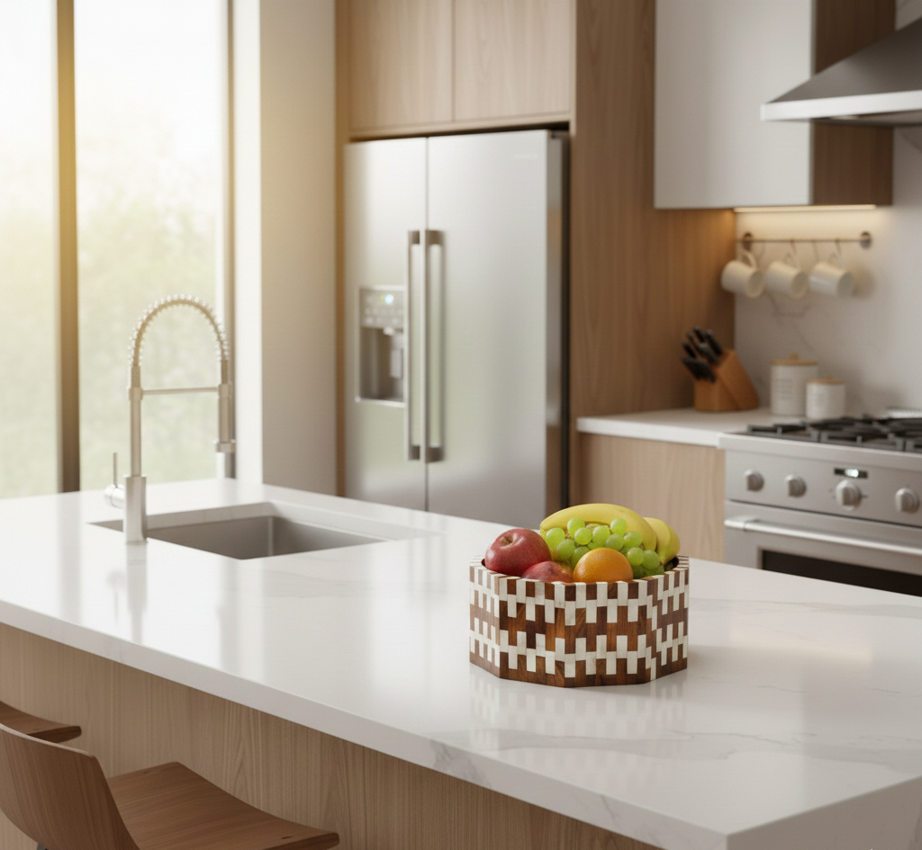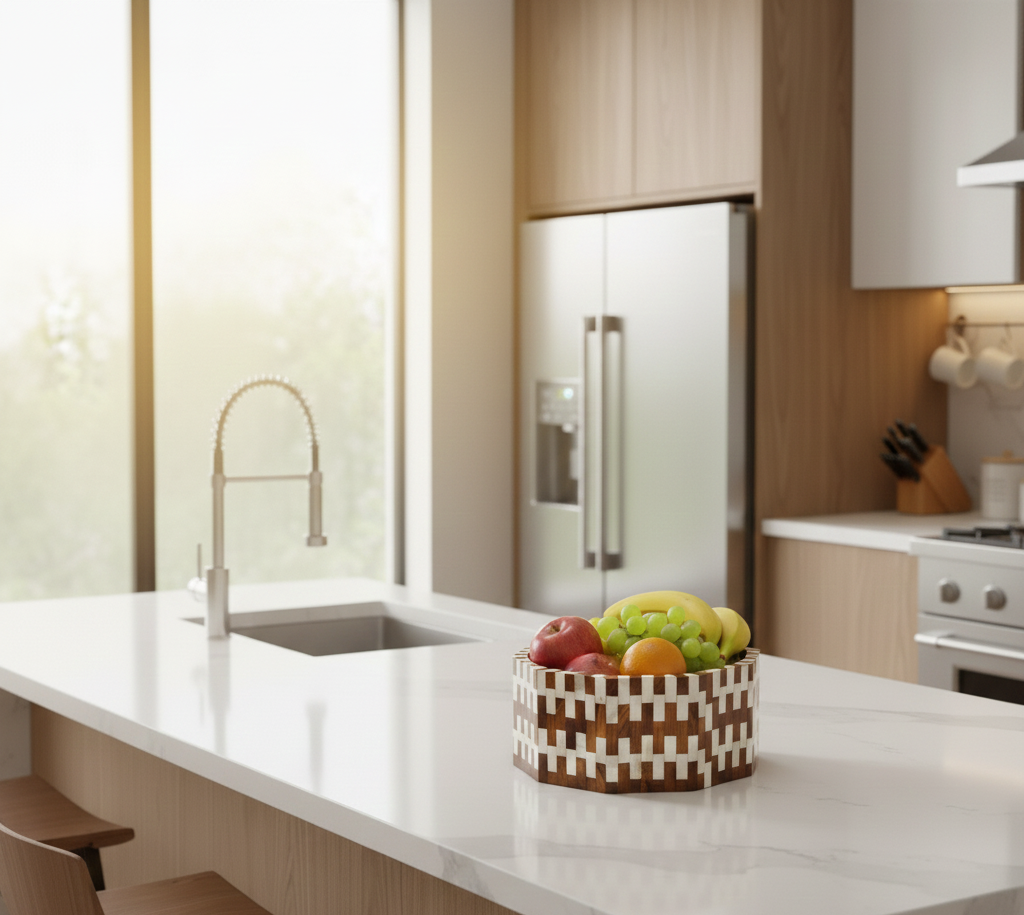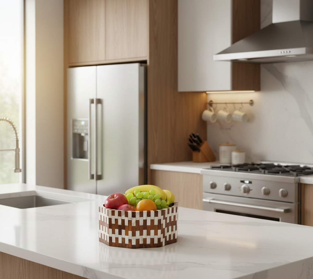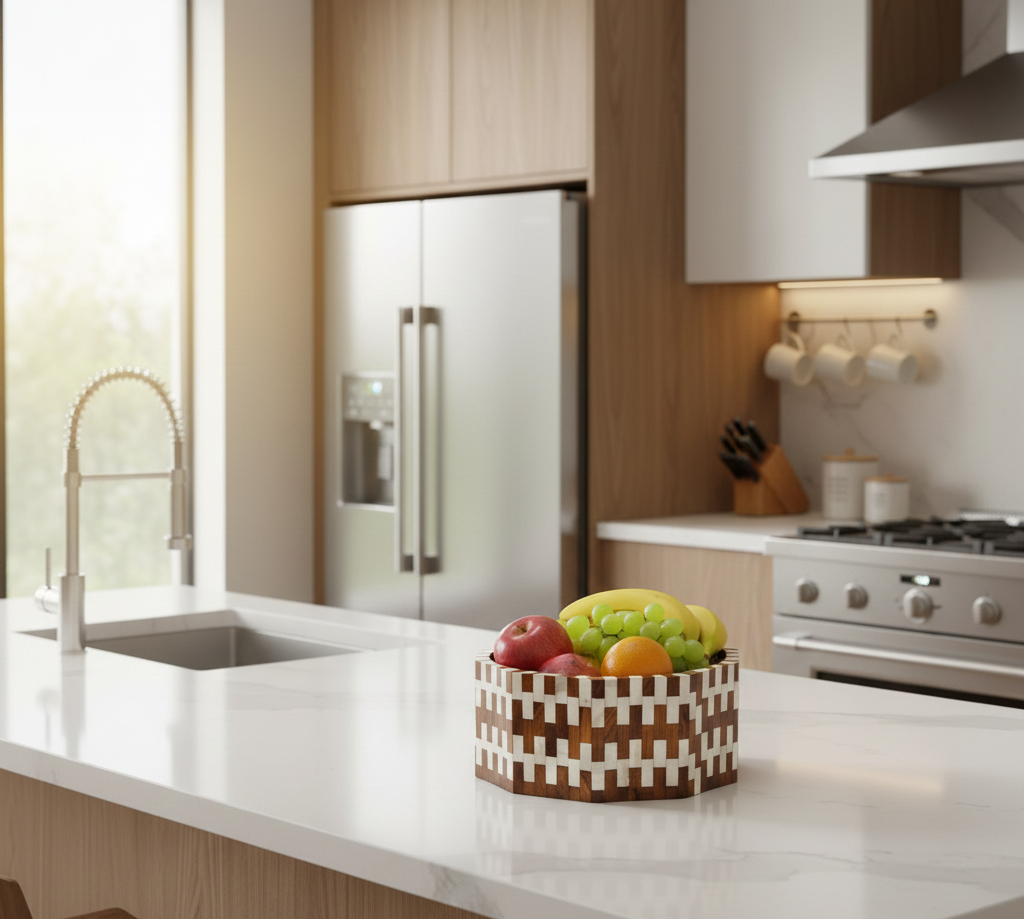 The RB Artisan Handcrafted Wood & Bone Inlay Fruit Basket is designed