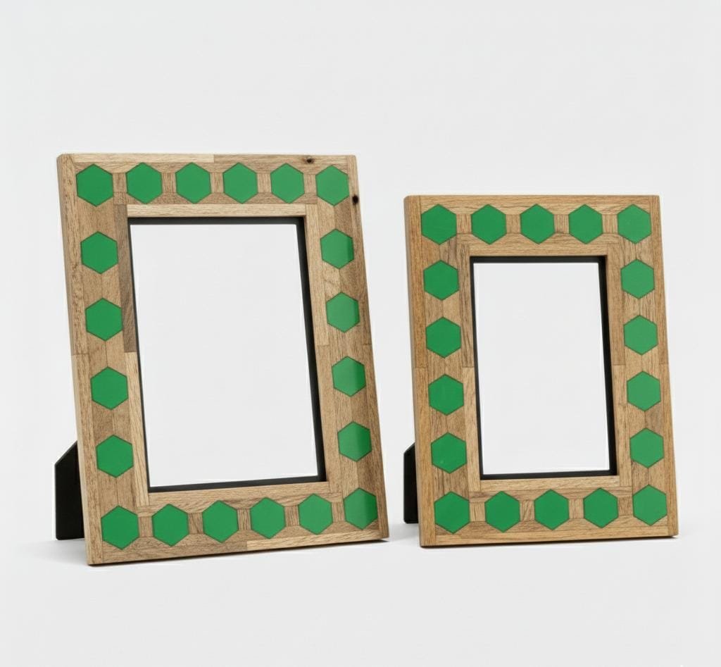 This Hexagon Inlay Photo Frame from RB ARTISAN blends natural wood tones with bold green resin for a striking visual contrast. Perfect for modern, rustic, or bohemian interiors, it serves as both a photo holder and a statement piece. Every frame is handcrafted by skilled artisans, ensuring quality, character, and individuality. Ideal for gifting or enhancing your home décor with timeless elegance.