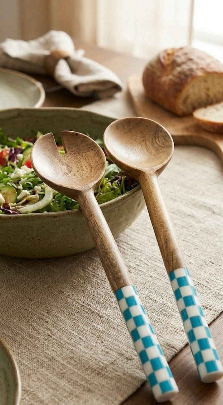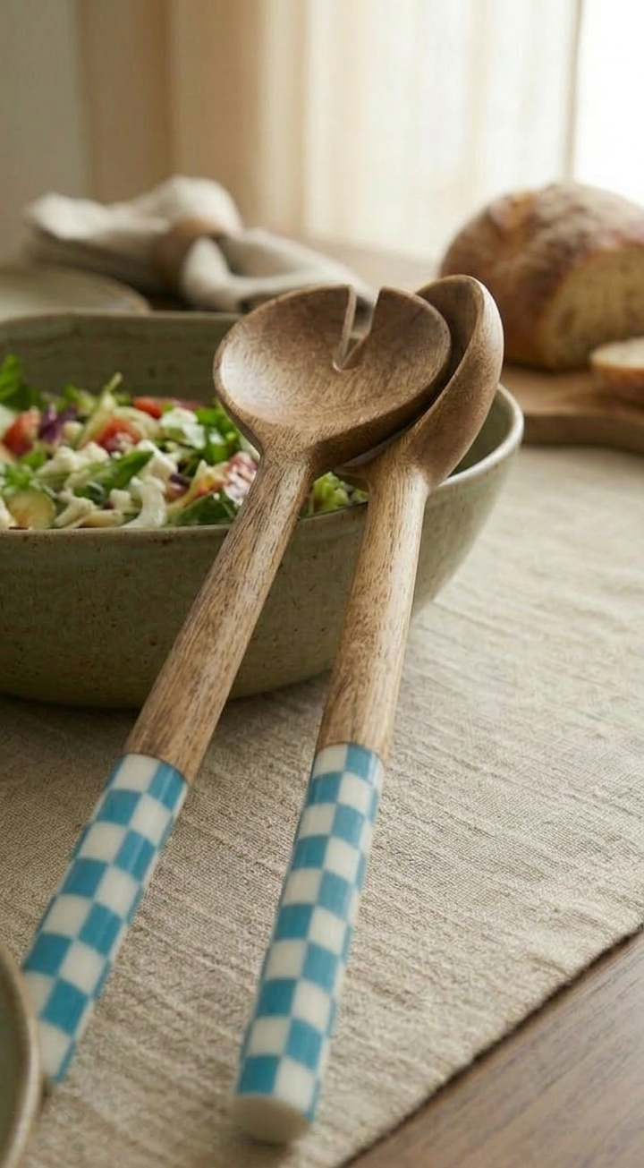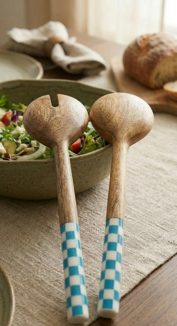 The RB ARTISAN Handcrafted Wooden Salad Server Set adds a vibrant touch to your dining experience with its striking blue and white checkered resin handle. Each set includes a solid mango wood spoon and fork, both fitted with a smooth rounded resin grip featuring a precise checkerboard pattern in bright blue and white — bold, cheerful, and instantly eye-catching.
