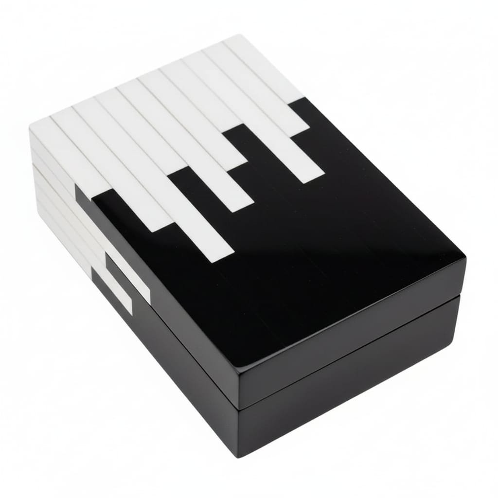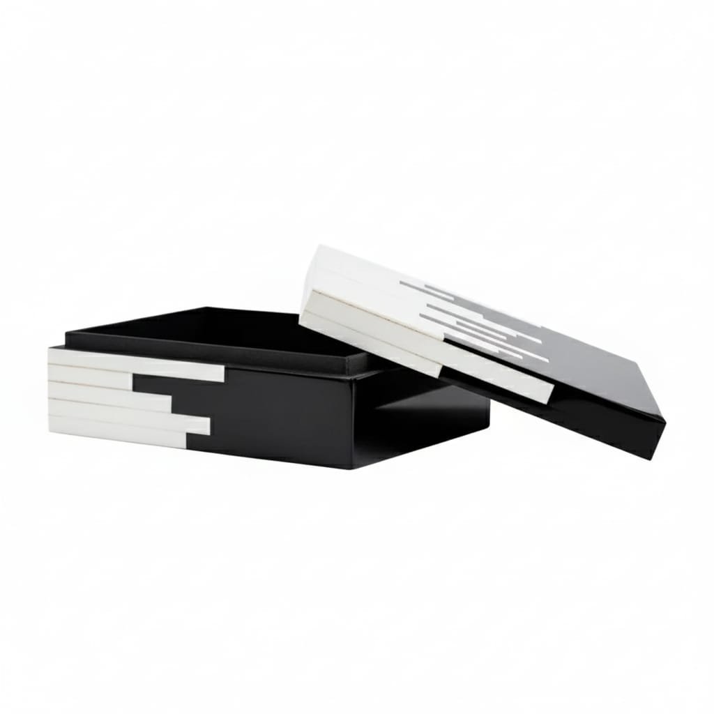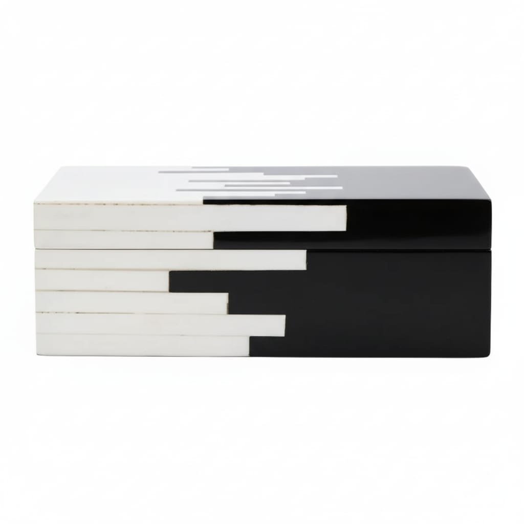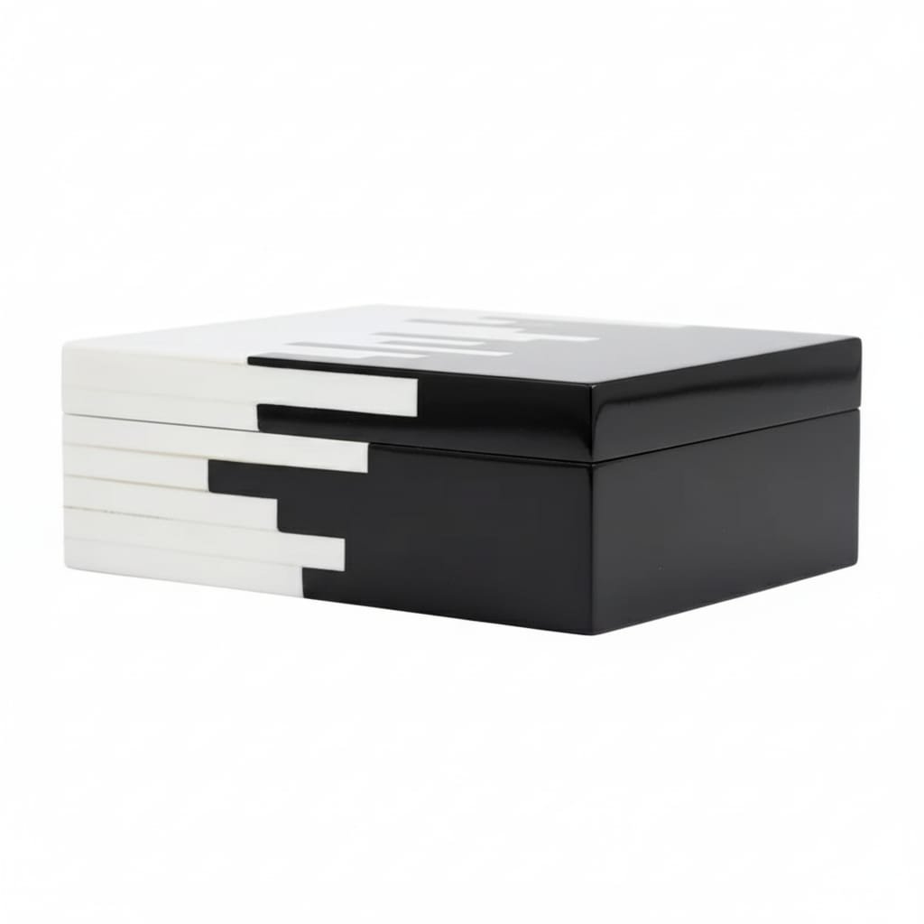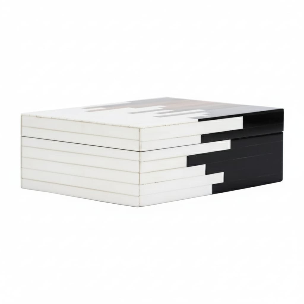 The RB ARTISAN Resin Storage Box Set of 3 Black White Piano Pattern is a masterpiece of contemporary resin artistry. Each box features a bold diagonal composition — one half in deep gloss black resin, the other in bright white resin — with precisely cut horizontal stripe inlays that create the iconic piano key effect along the transition zone. This intricate striped detailing requires exceptional skill and precision, making each box a true collector’s piece.