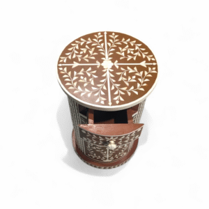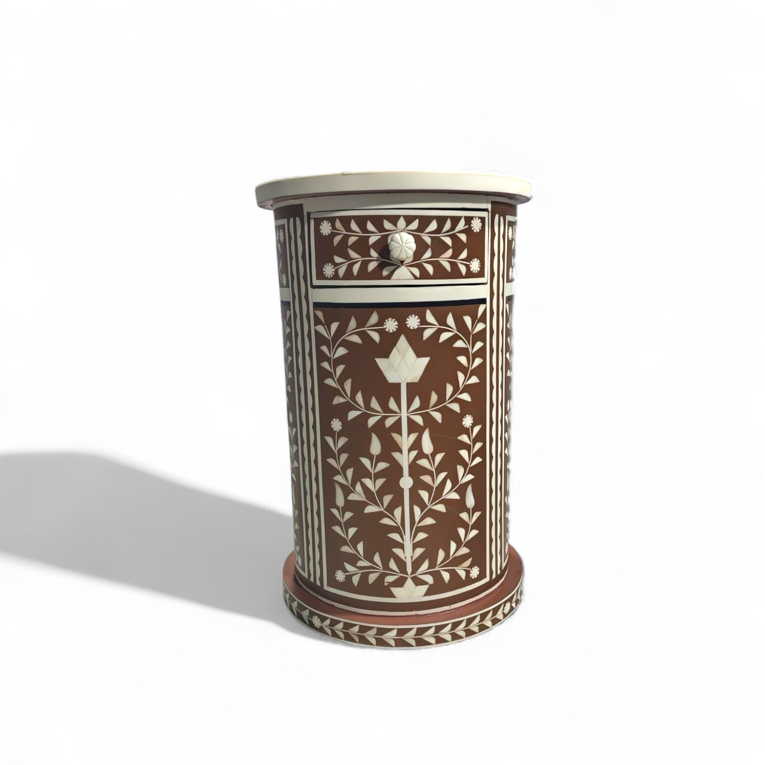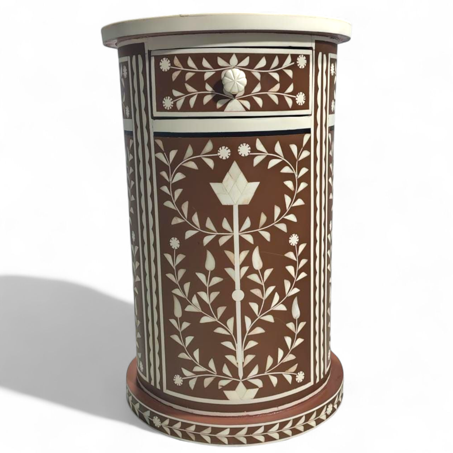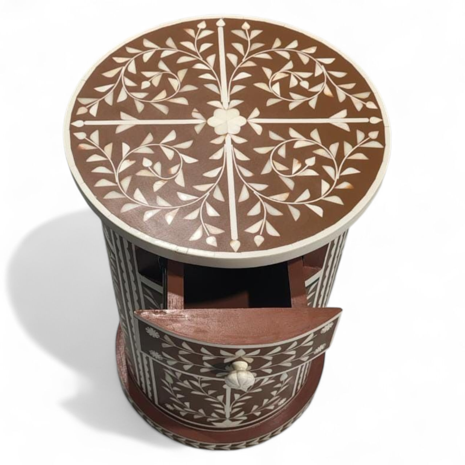 RB Artisan Round Brown & White bone Inlay Bedside Table with Drawer is a beautifully handcrafted piece that combines traditional artistry with modern functionality.