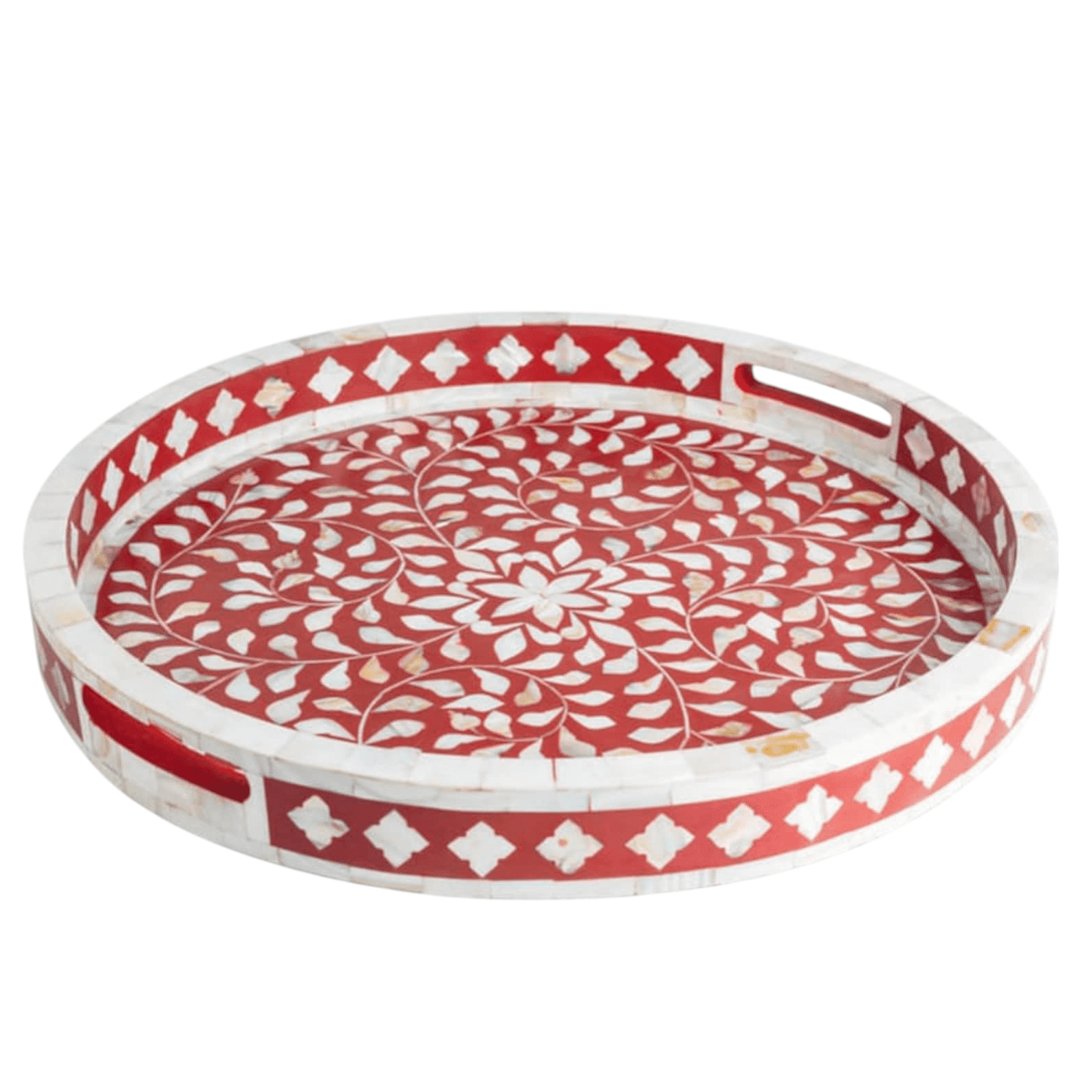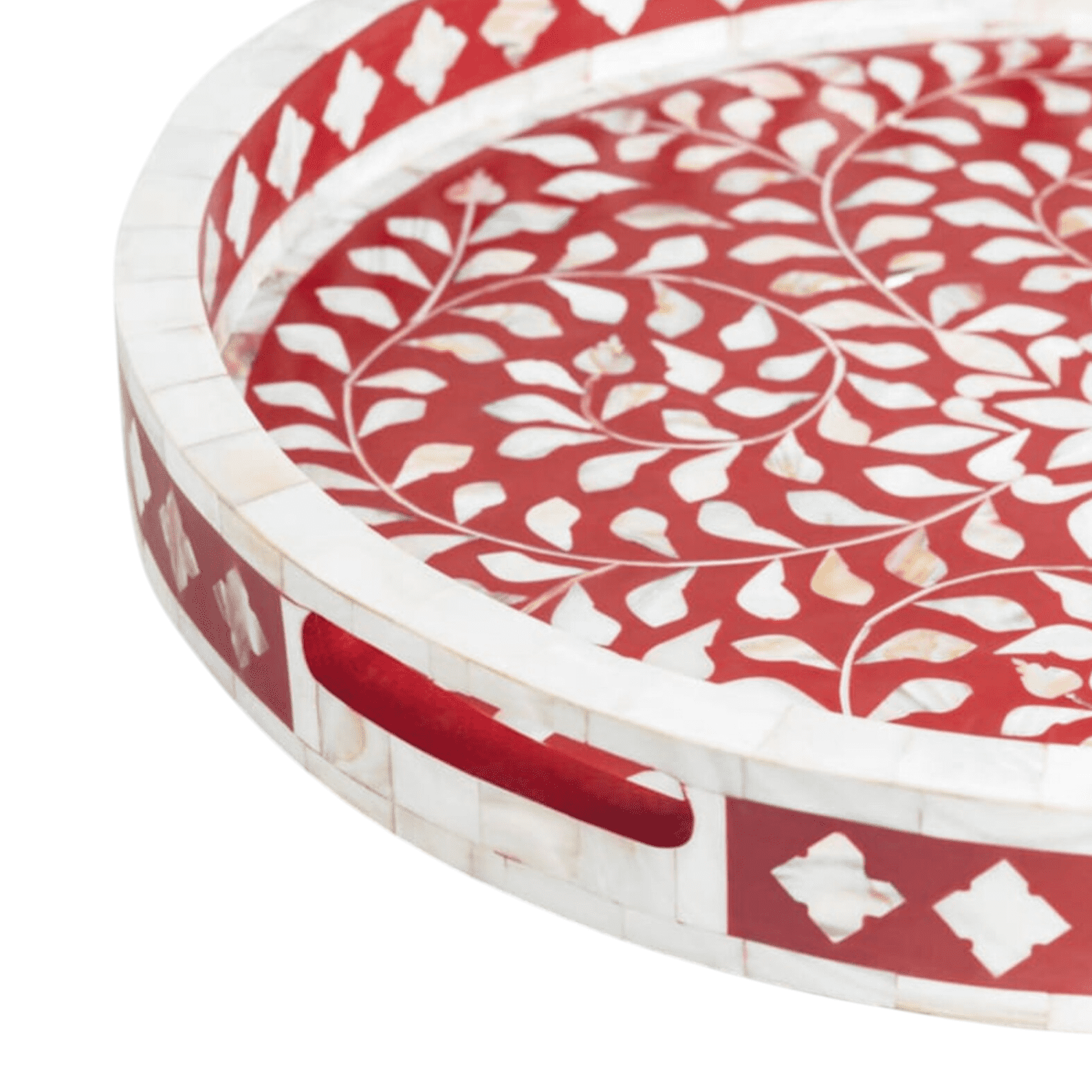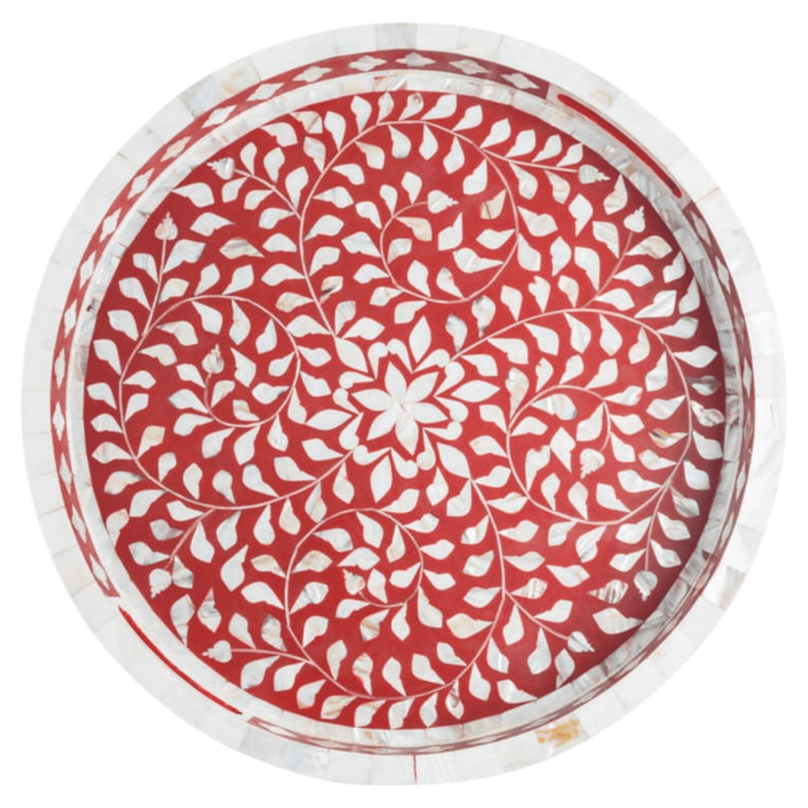This Red Floral Inlay Tray by RB ARTISAN features a vibrant red base paired with intricate white inlay work. Ideal for premium table settings, traditional festivities, and as a high-end gift option.
