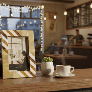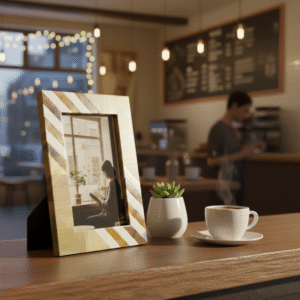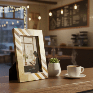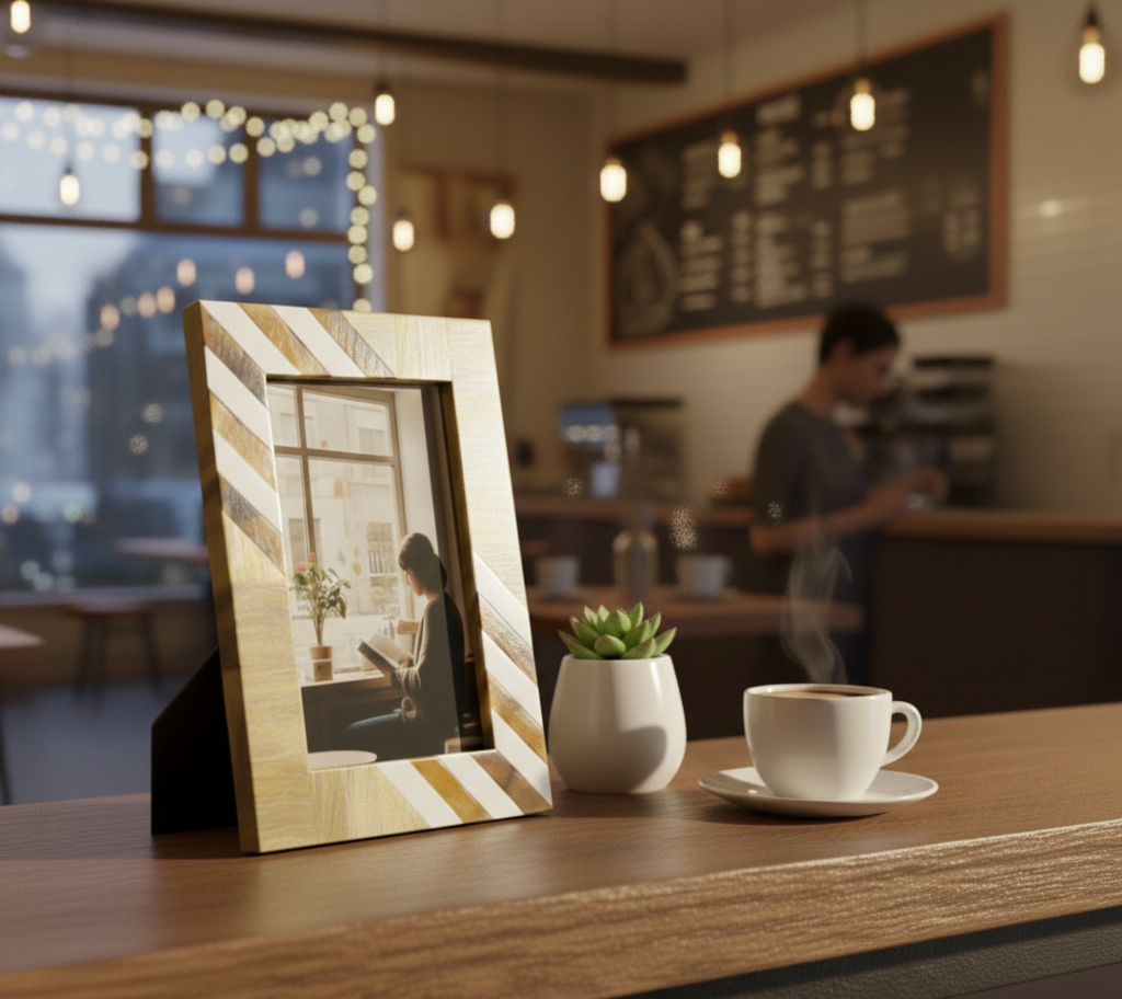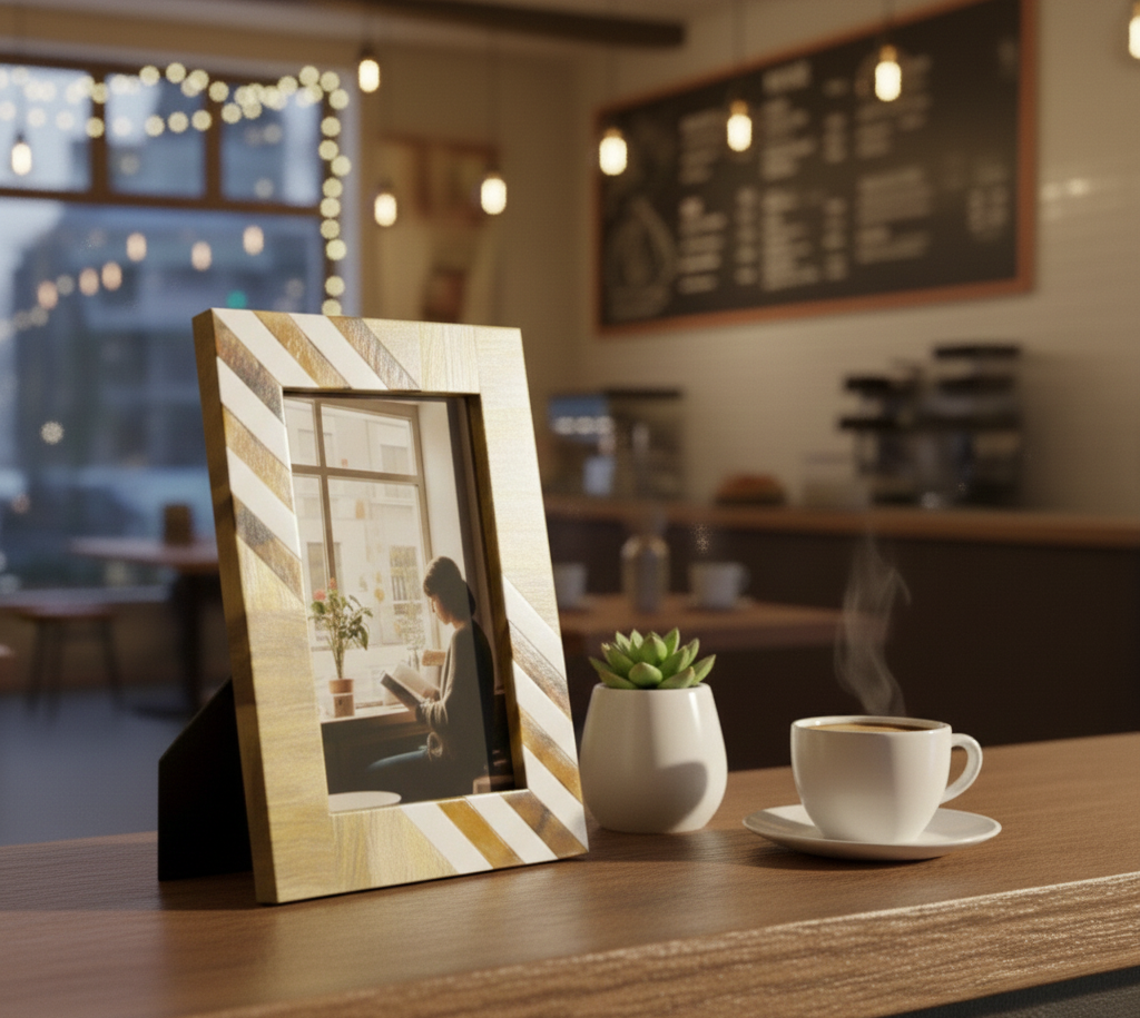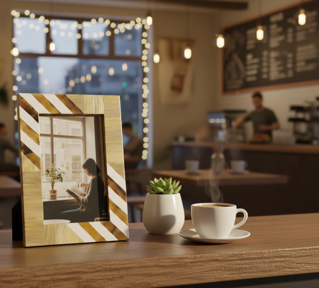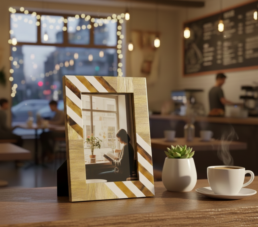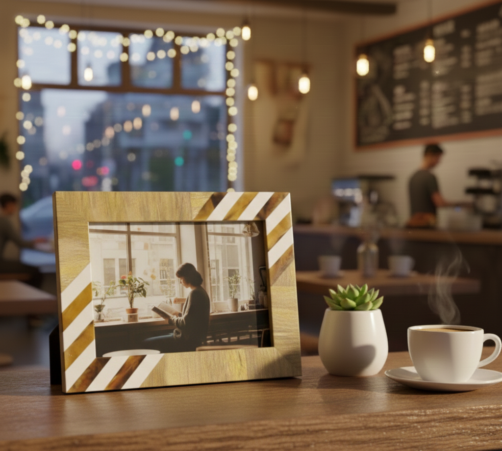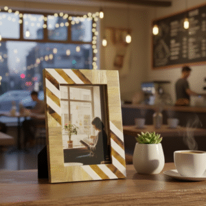 This handcrafted Resin & Wood Photo Frame from RB Artisan features an elegant striped pattern combining natural wood tones with smooth resin accents. Designed to enhance modern interiors, it is perfect for tabletop display in homes, offices, cafés, and gifting collections.